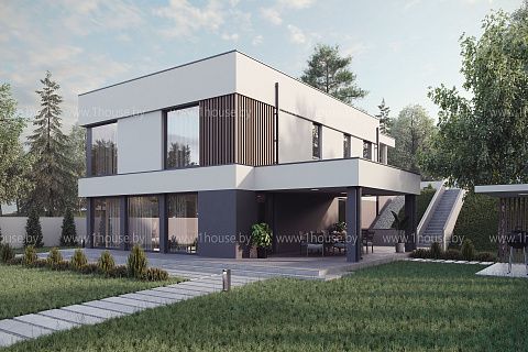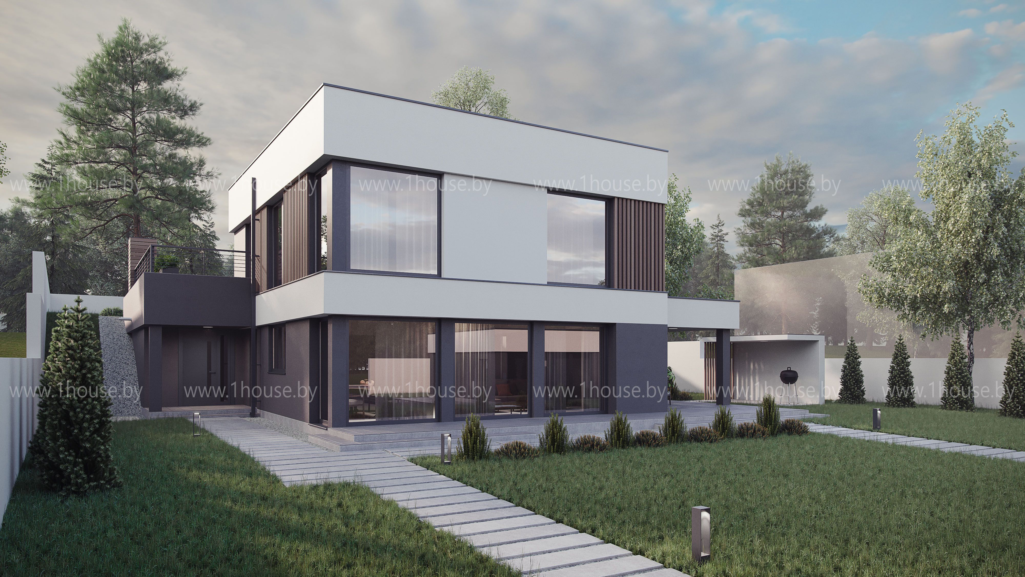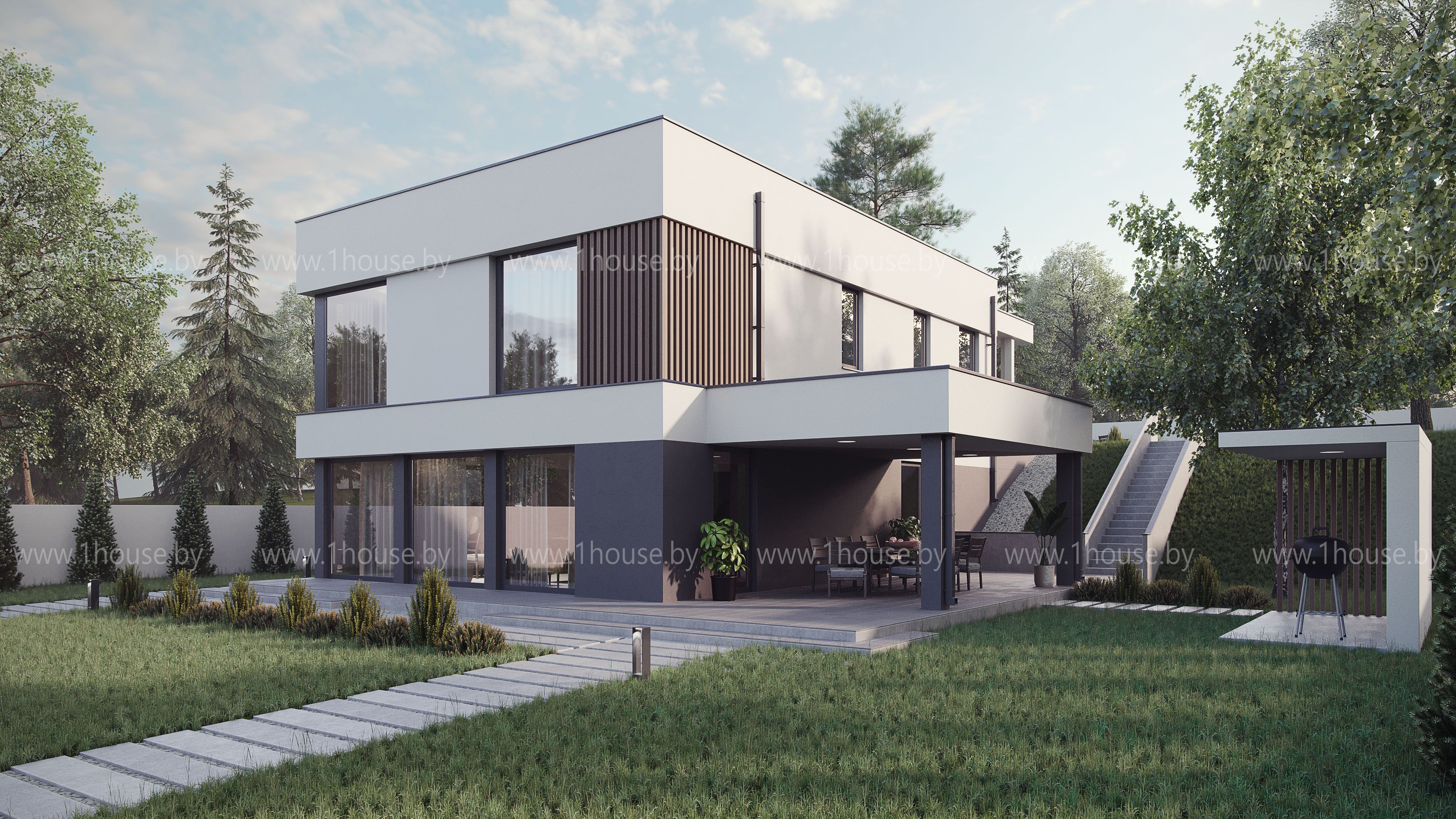Внешний вид дома можно назвать довольно лаконичным и геометричным, первый этаж полностью выкрашен в черный, второй – из белой штукатурки со вставками деревянного планкена. Выразительность и современность дому придают угловые панорамные окна в гостиной и мастерспальне на втором этаже.