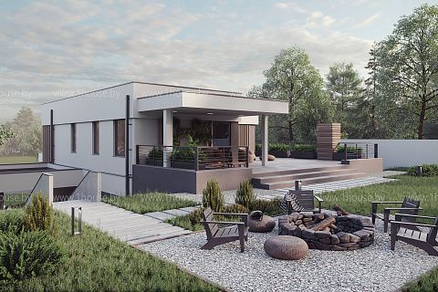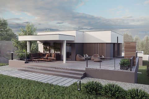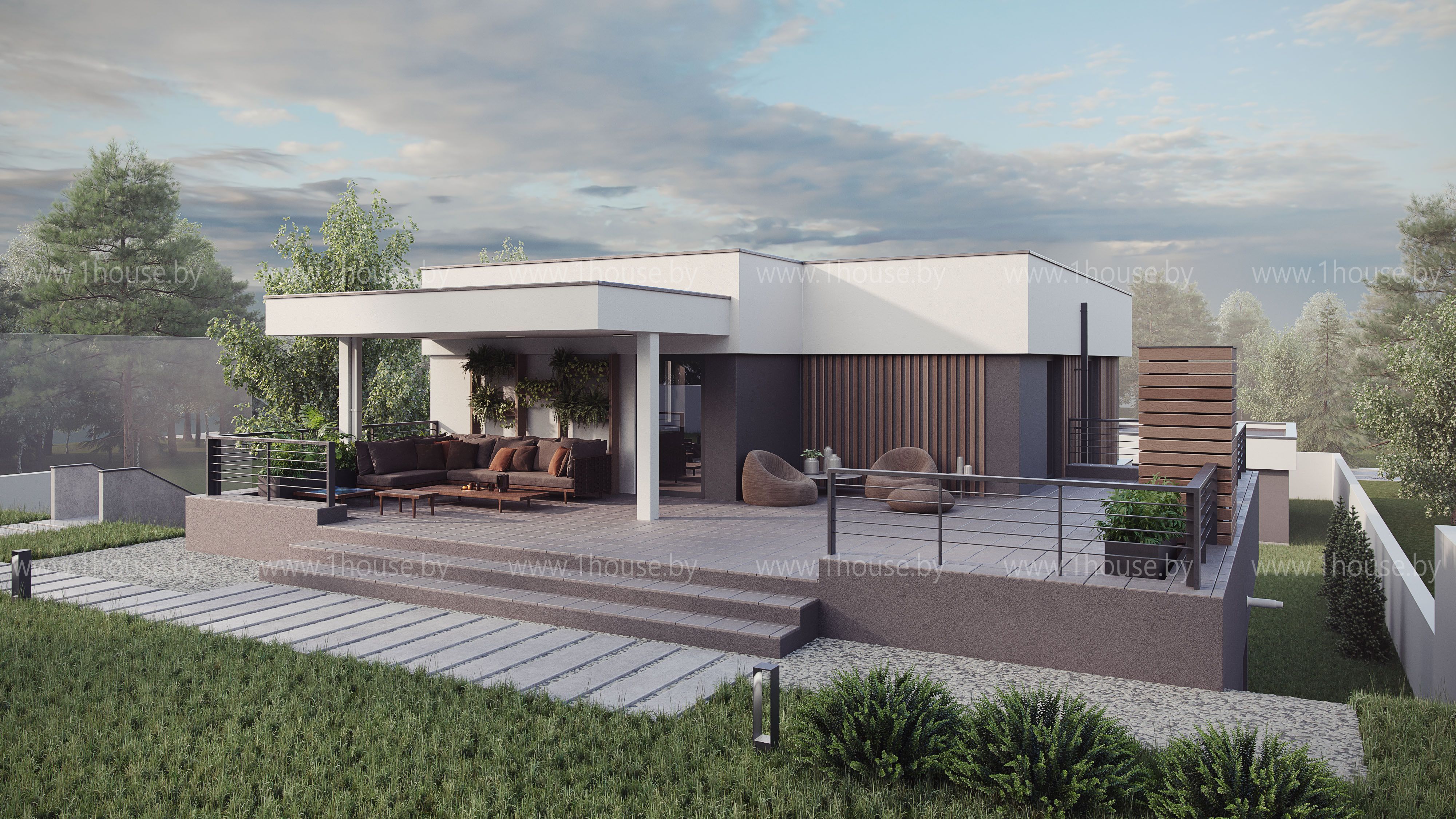 На нижнюю террасу осуществляется выход из гостиной, часть террасы находится под навесом.