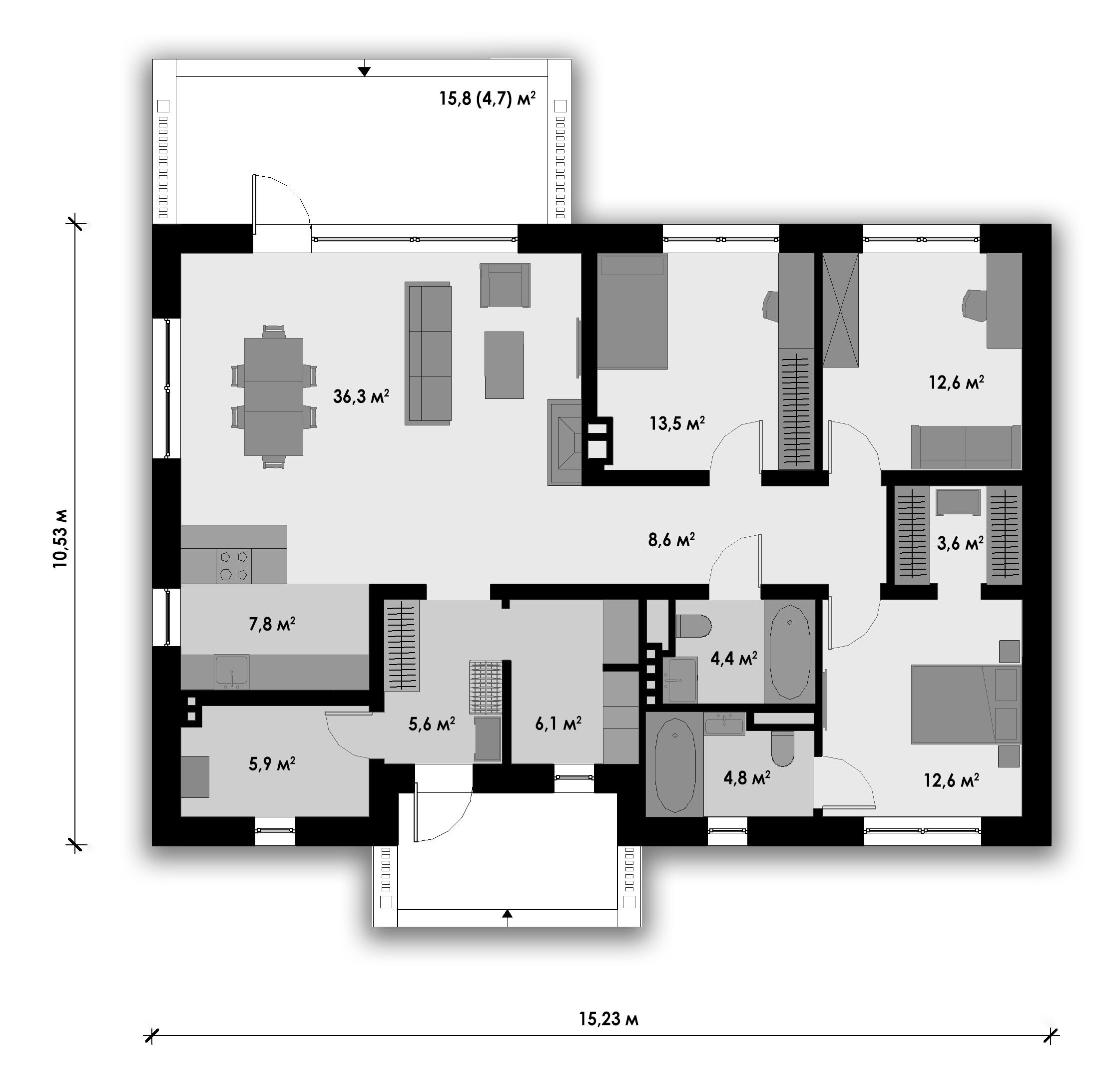 Изменения и доработки проекта, которые не затрагивают объём дома и несущие стены, возможны в рамках типового проекта, если изменений много и они затрагивают множественные изменения объёма дома и несущих конструкций, то лучше сразу разрабатывать индивидуальный проект на основе типового. Примеры несущественных изменений проекта: перенос или изменений перегородок, окон, дверей, высоты потолка, изменение назначения помещений, изменение размеров пола террасы. Существенные изменения типового проекта: перемещение несущих стен и колонн, пропорциональное увеличение площади дома, изменение этажности дома.