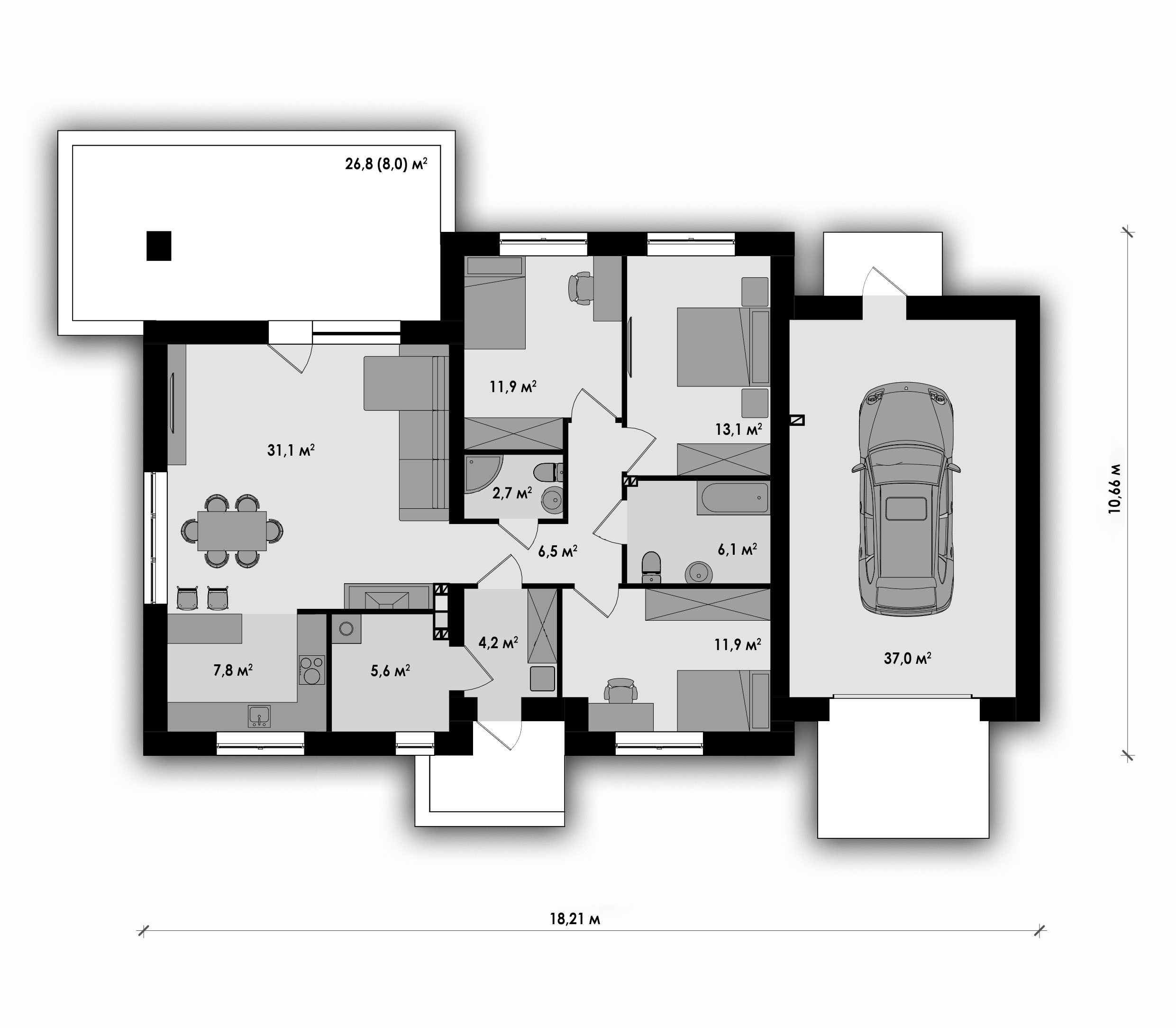 Проект «Термис Г1» — логичное развитие базовой версии одноэтажного дома «Термис» с пристроенным гаражом на один автомобиль. Основная планировка осталась без изменений: три спальни, два санузла, мини-котельная и просторная гостиная с выходом на террасу. Пристройка гаража сделана с максимальным удобством — переход в дом осуществляется напрямую через тамбур. Такое решение повышает комфорт повседневного использования, создаёт дополнительное место для хранения и делает дом более практичным в любое время года.