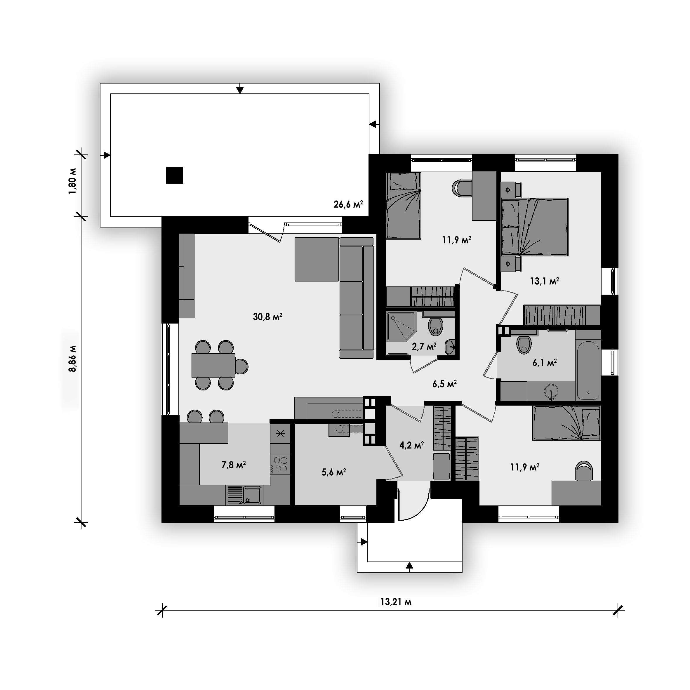 "Термис" — одноэтажный дом с тремя спальнями и просторной гостиной, рассчитанный на комфортную повседневную жизнь семьи. Планировка продумана до мелочей: зона прихожей переходит в общее пространство кухни и гостиной с выходом на террасу. Окна в пол усиливают ощущение открытости и позволяют наполнить дом естественным светом.