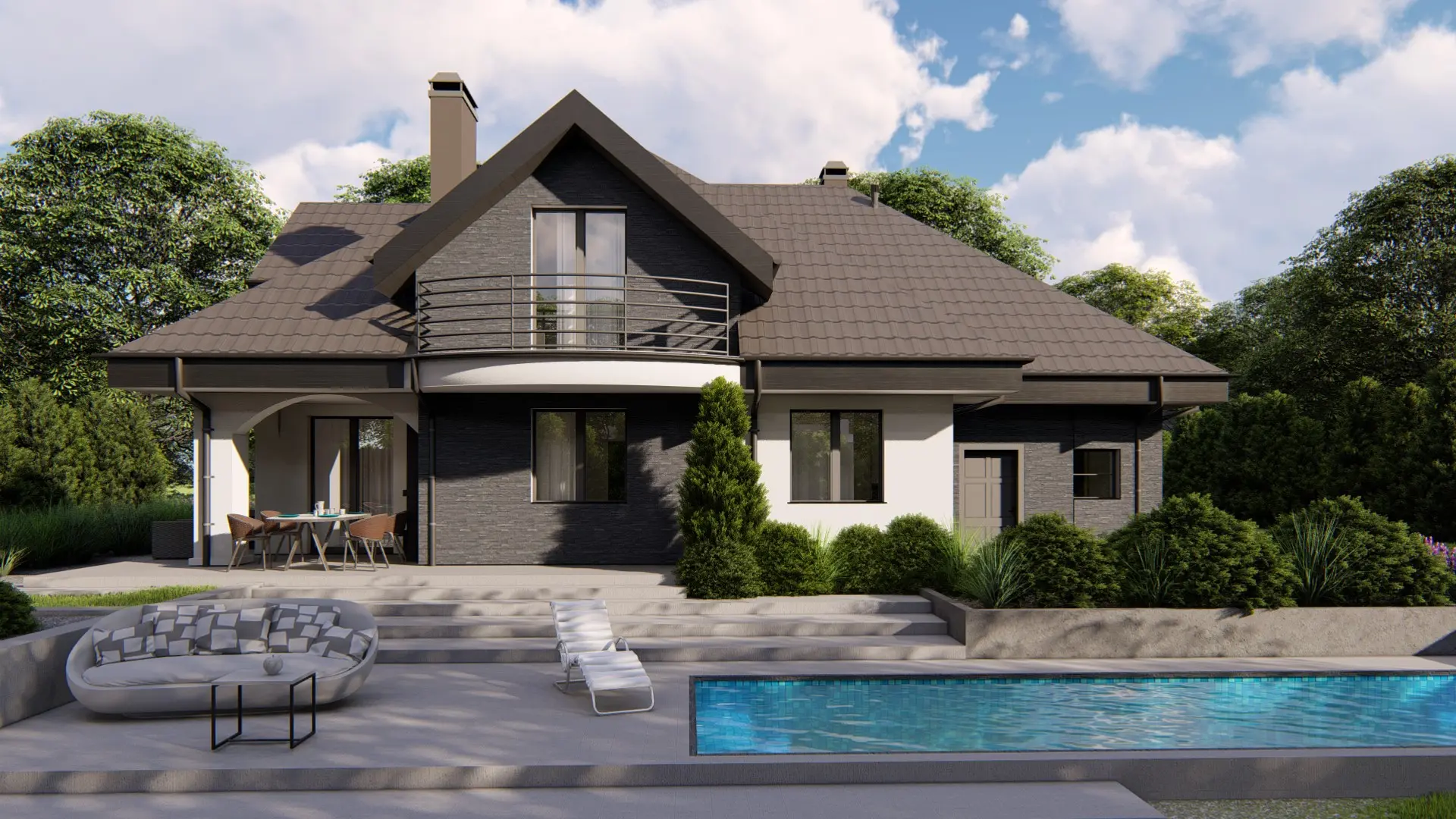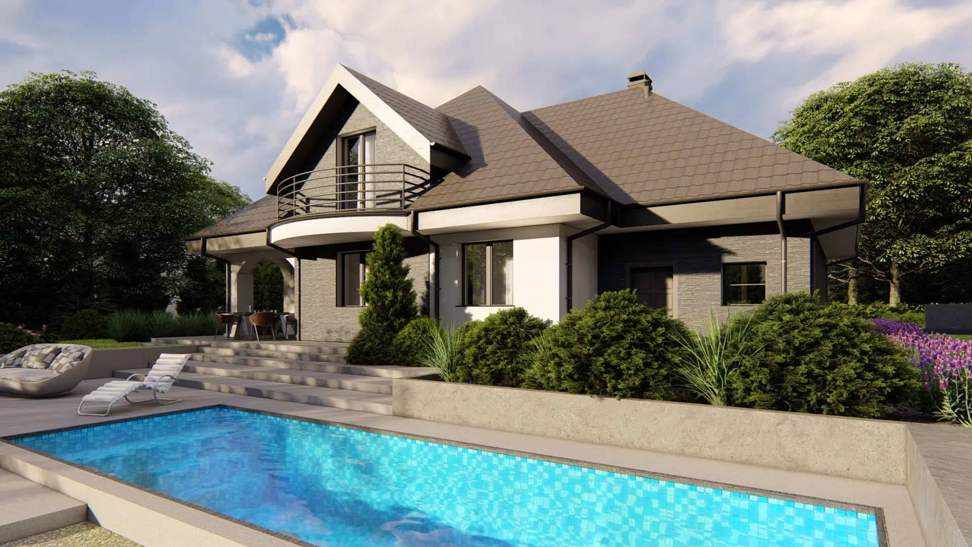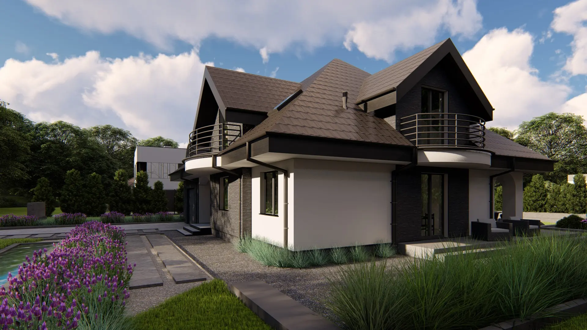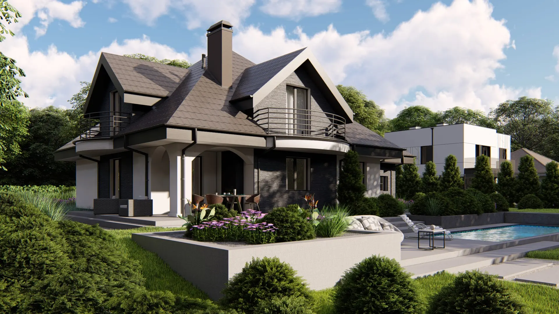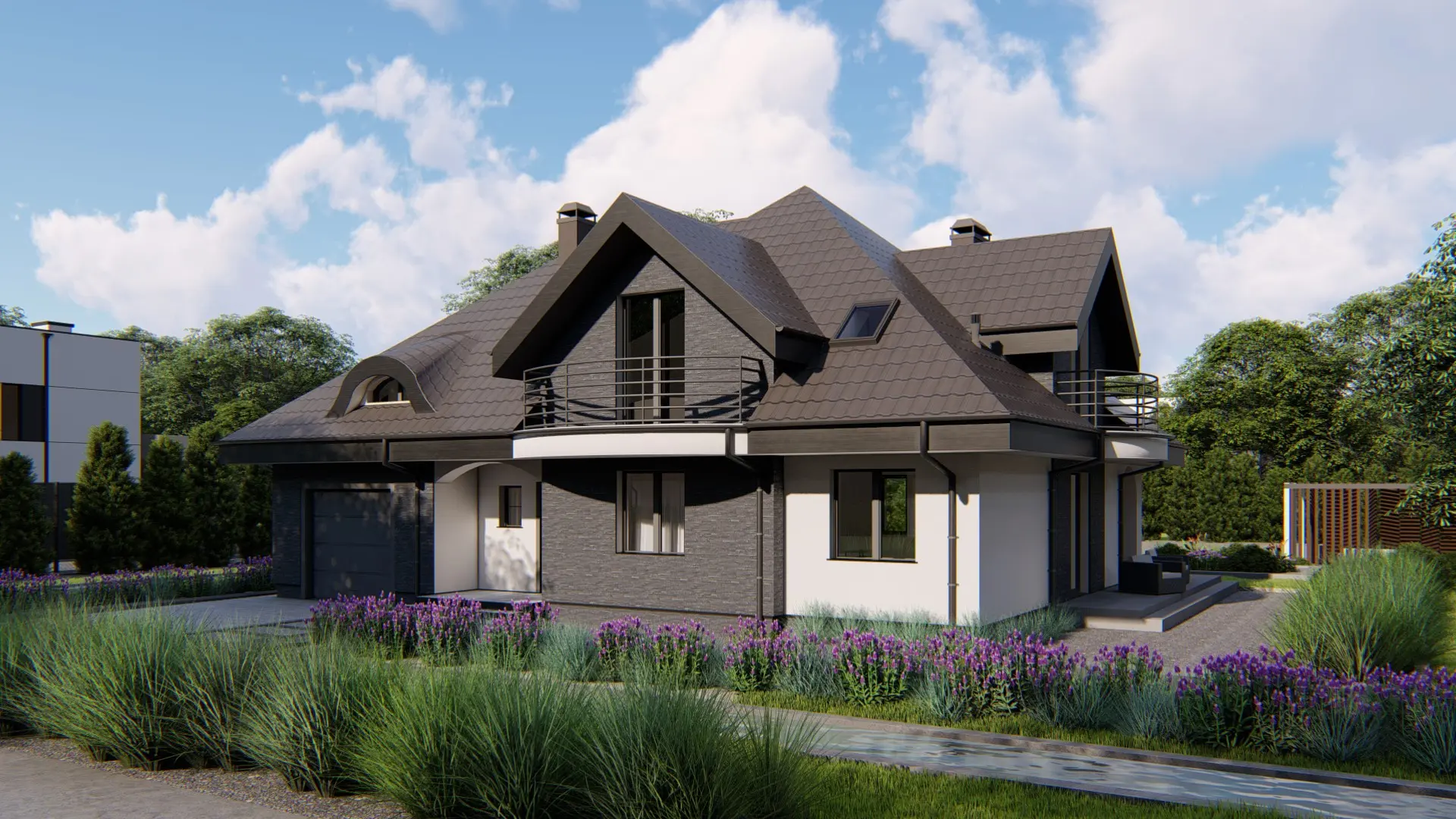 Этот элегантный проект загородного дома с гаражом - версия проекта Z18. Классический вид этому изящному дому придают прекрасные балконы и фасадные окна на мансарде.