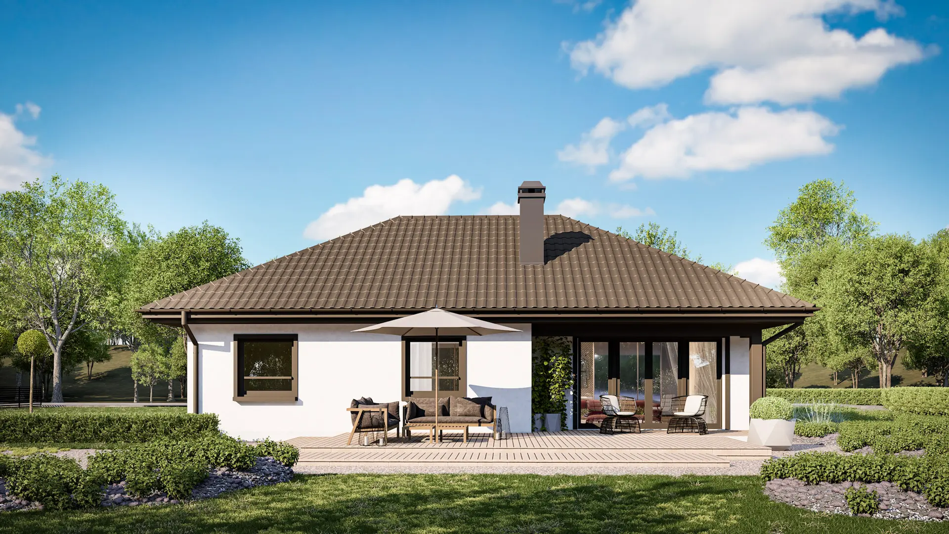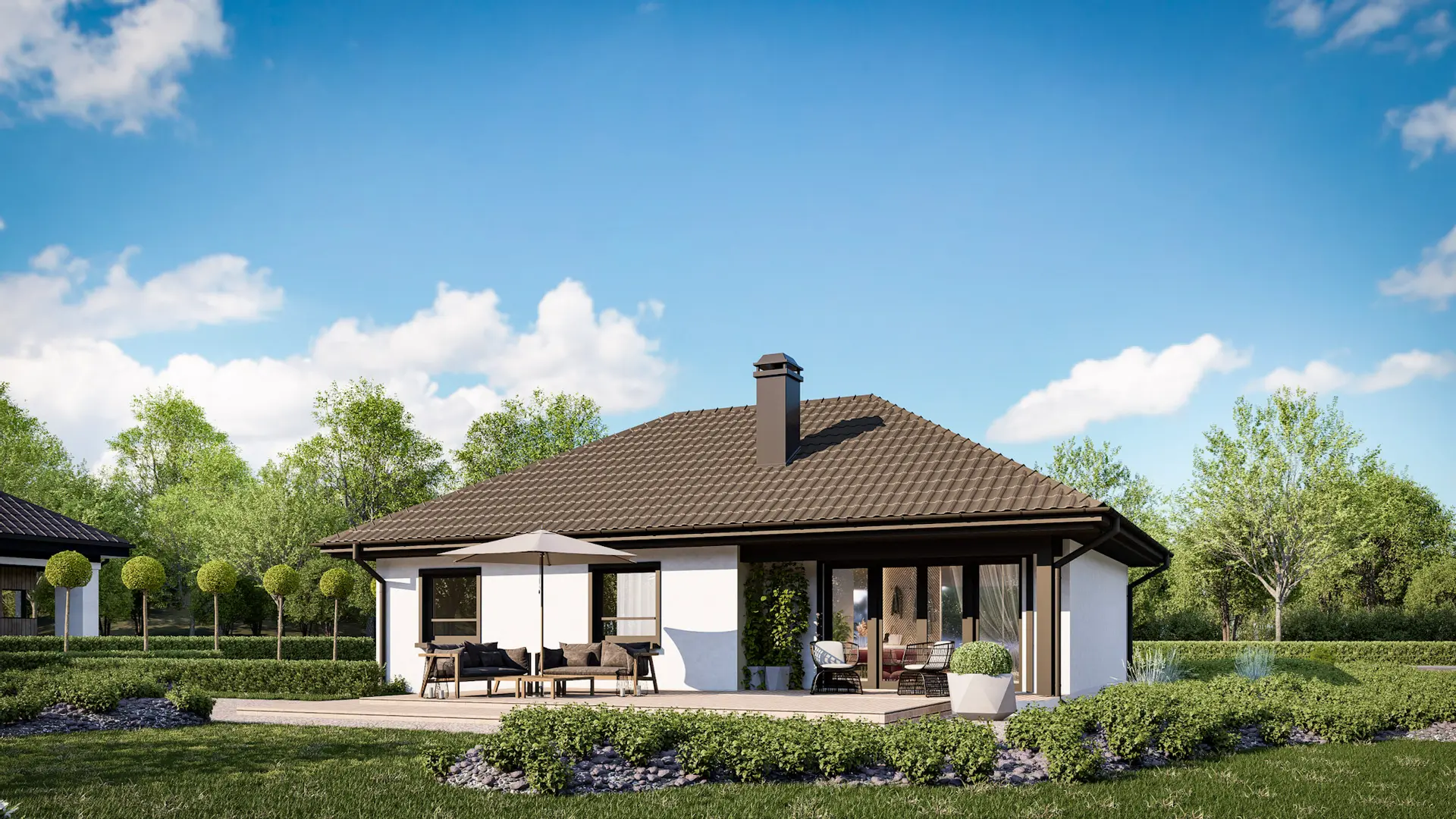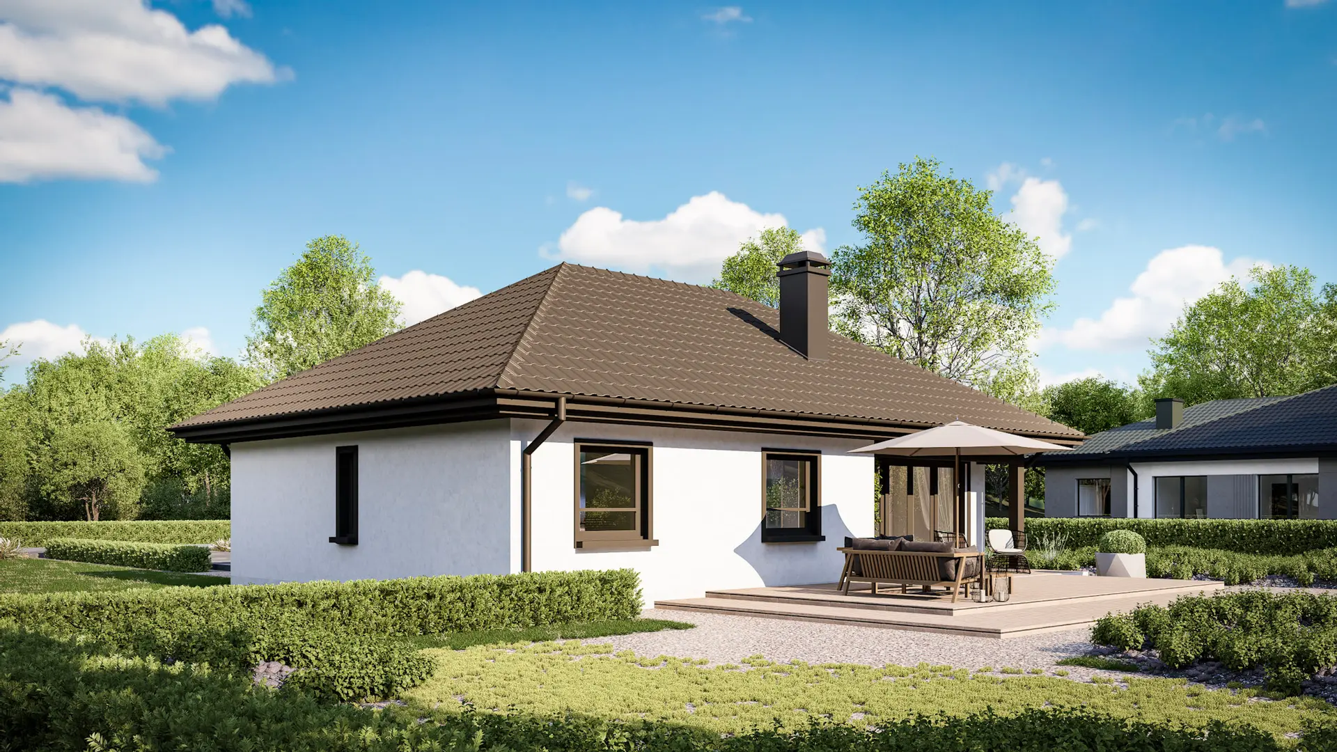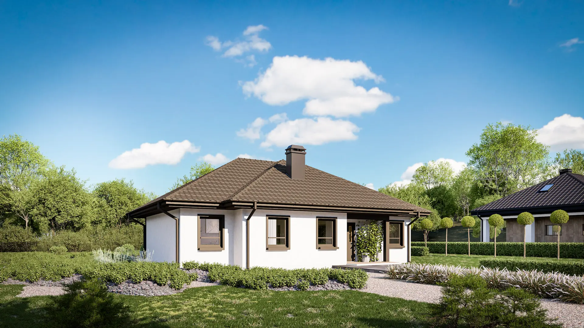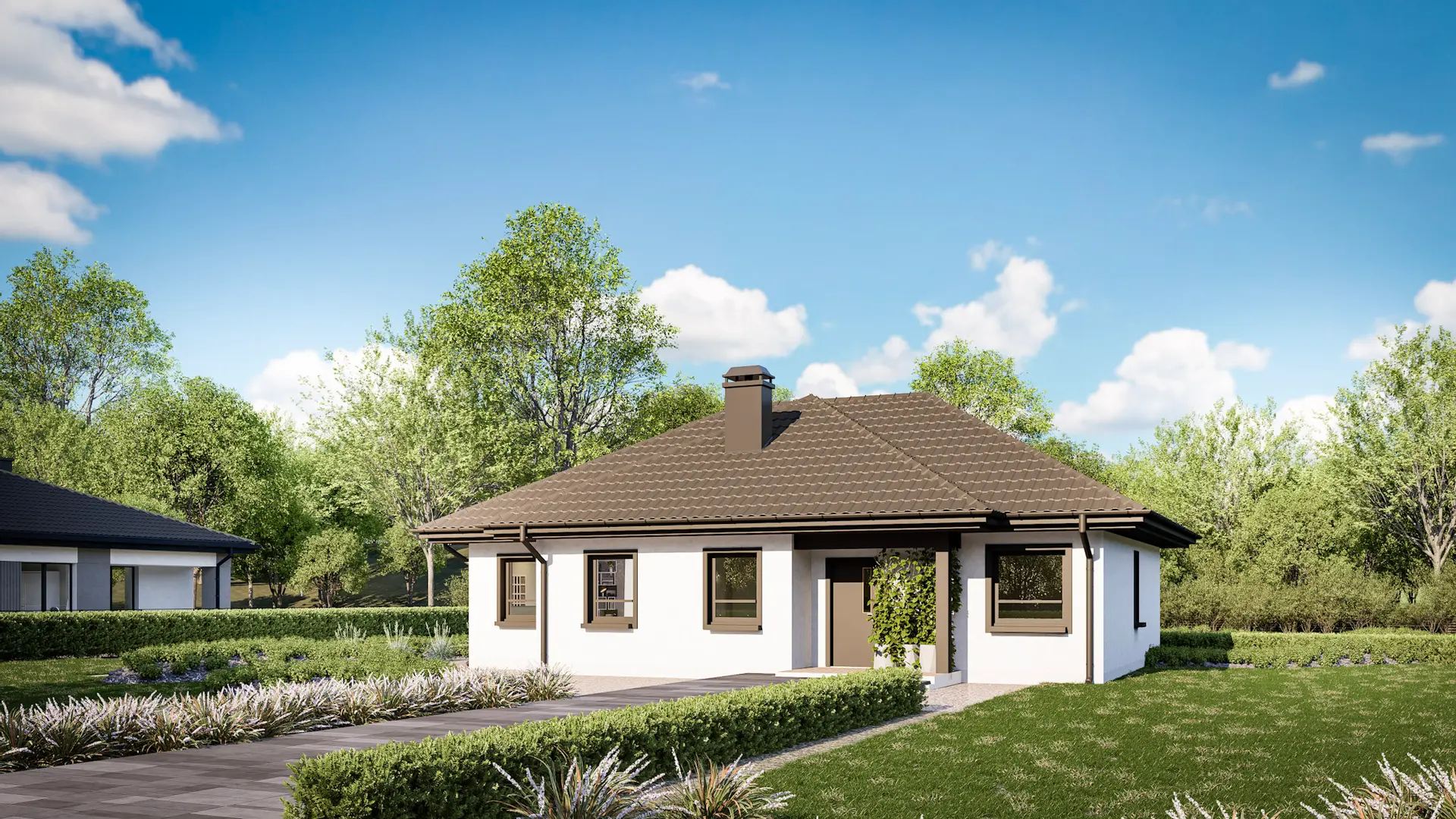 Предлагаем вашему вниманию компактный и удобный одноэтажный дом Z23. Его характерный классический дизайн подчеркивает отдела фасадов из облицовочного камня и многоскатная крыша. Интерьер удачно сочетает традиционные и современные решения.