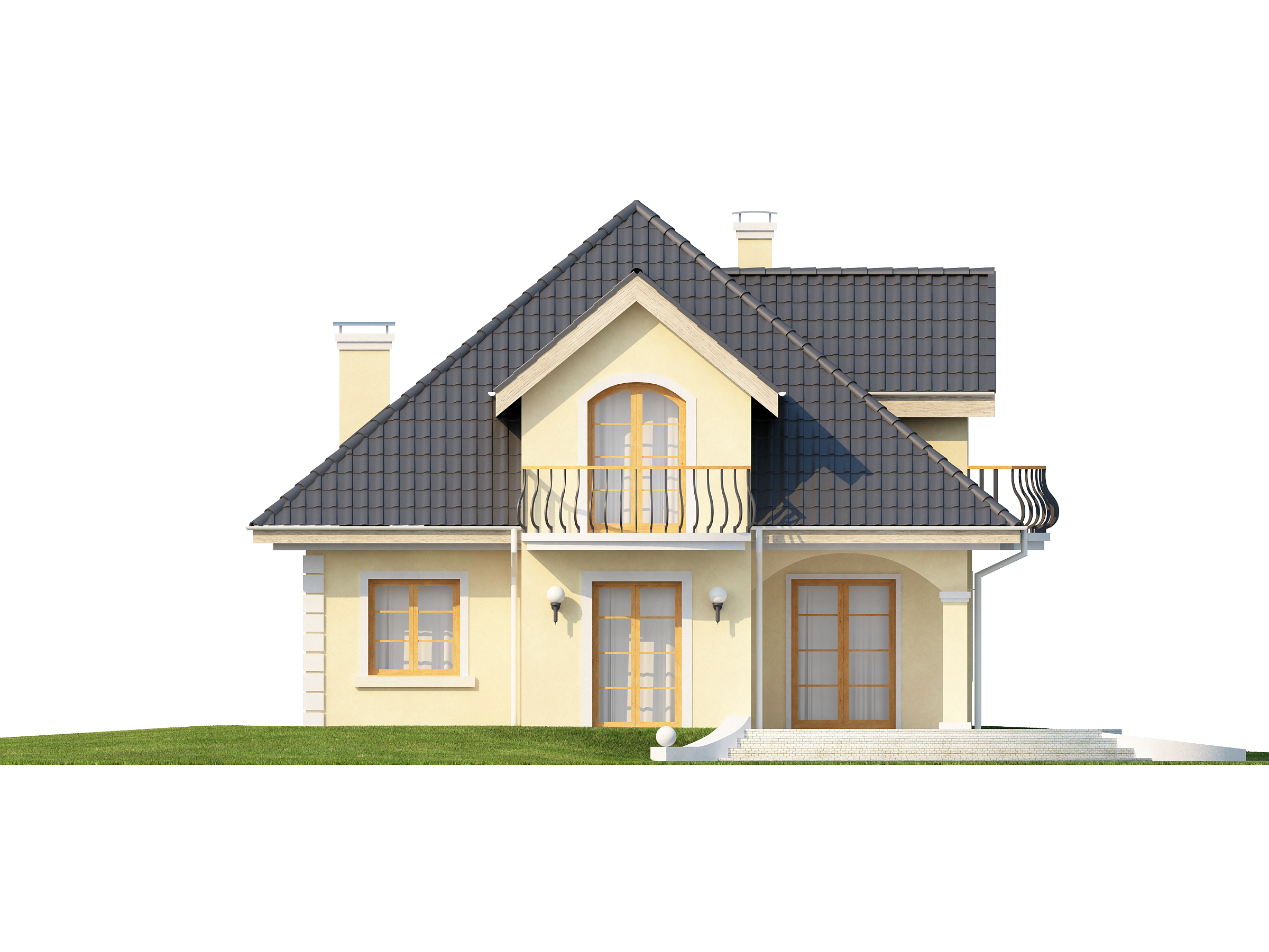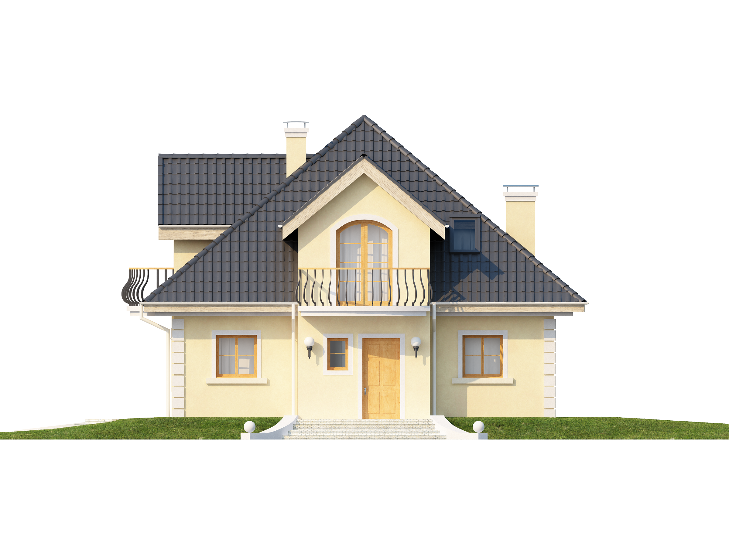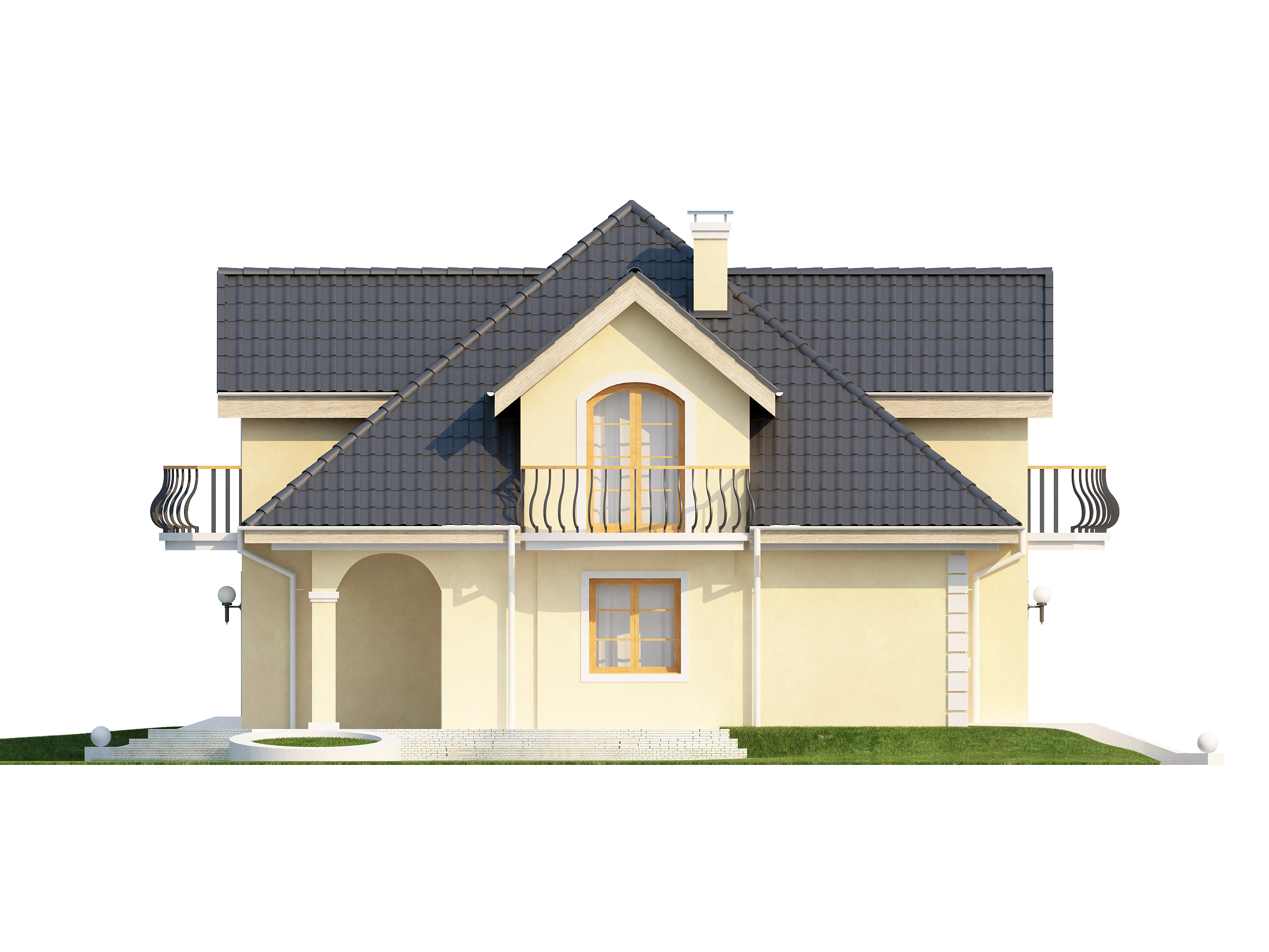 Проект Z27 представляет собой изысканный классический дом с мансардой, с красивыми мансардными окнами и балконами. Дополнительным украшением служит и аркада, оформляющая террасу. Интерьер дома уютный, функциональный и оригинальный.