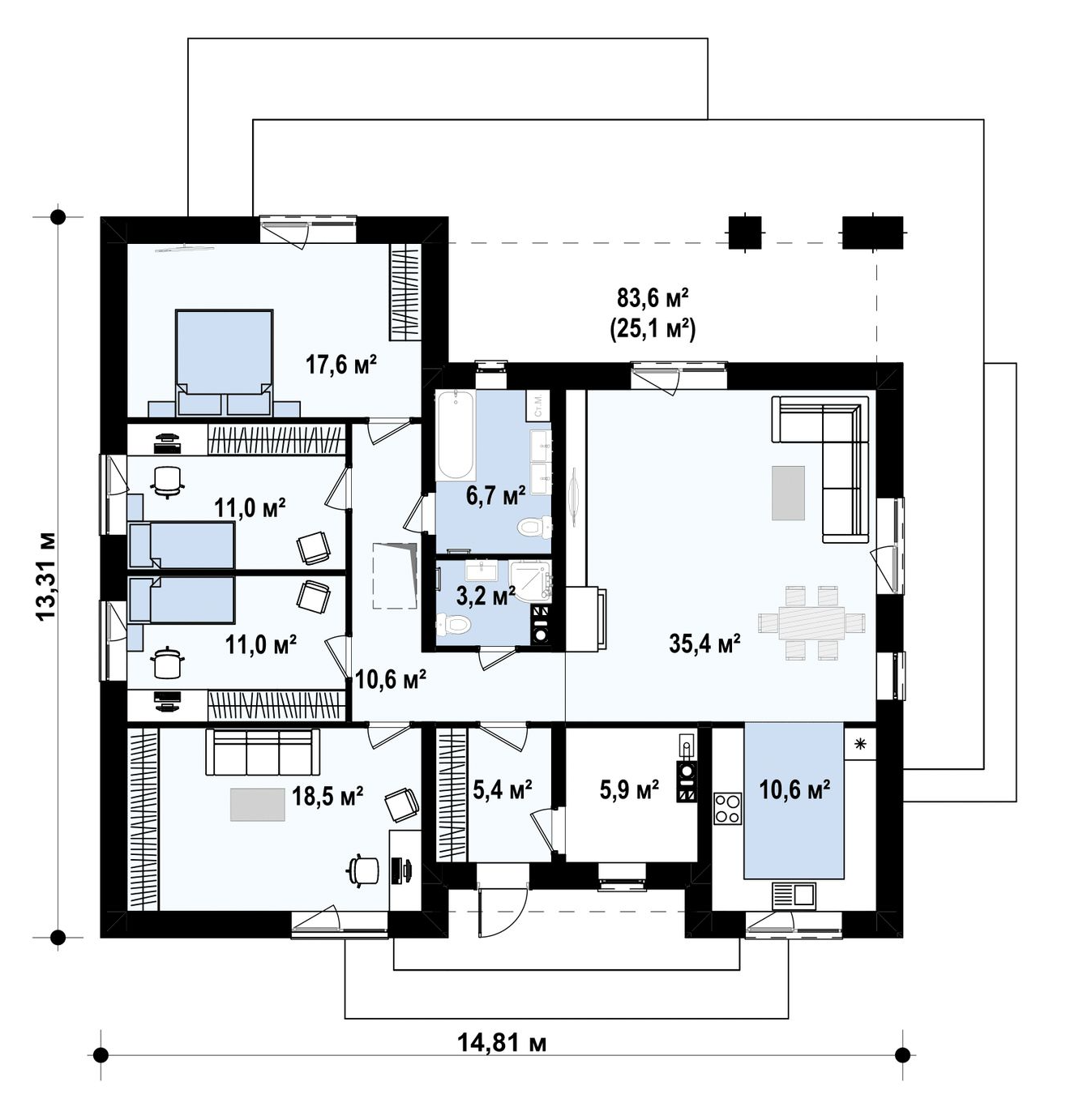 Наши проекты разработаны под стеновые блоки из газобетона, керамзитобетона или керамического блока, поскольку они являются взаимозаменяемыми. Состав наружной стены представляет собой пирог из блока 375мм и утеплителя 50мм/100мм, внутренние несущие стены — это блок 250мм, перегородки — блок 100мм. Вместо блоков 375мм/250мм/100мм, можно использовать блоки 300/400мм, 300мм, 120/150мм соответственно.