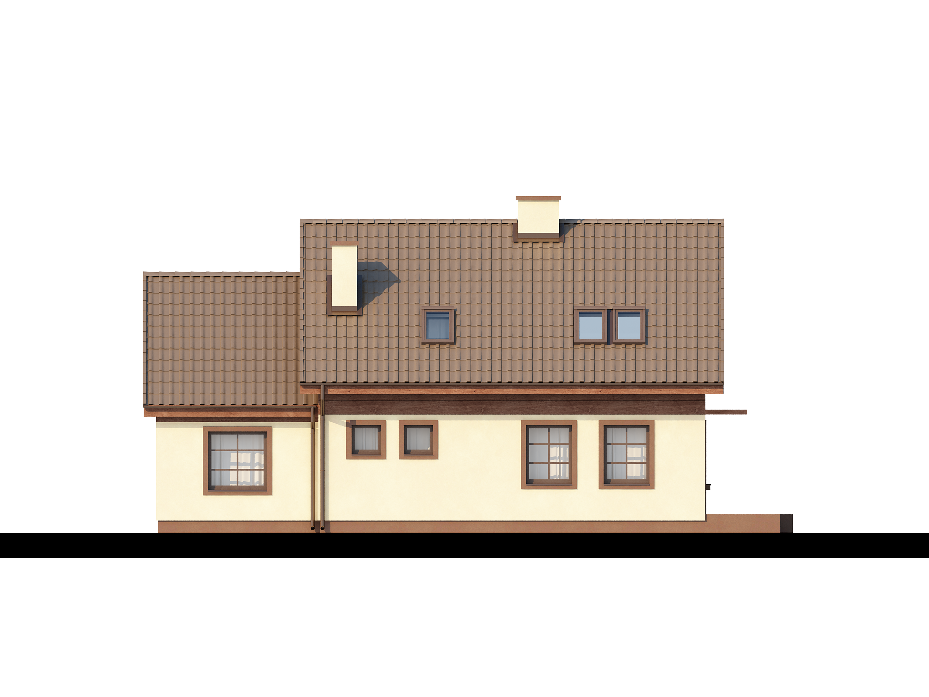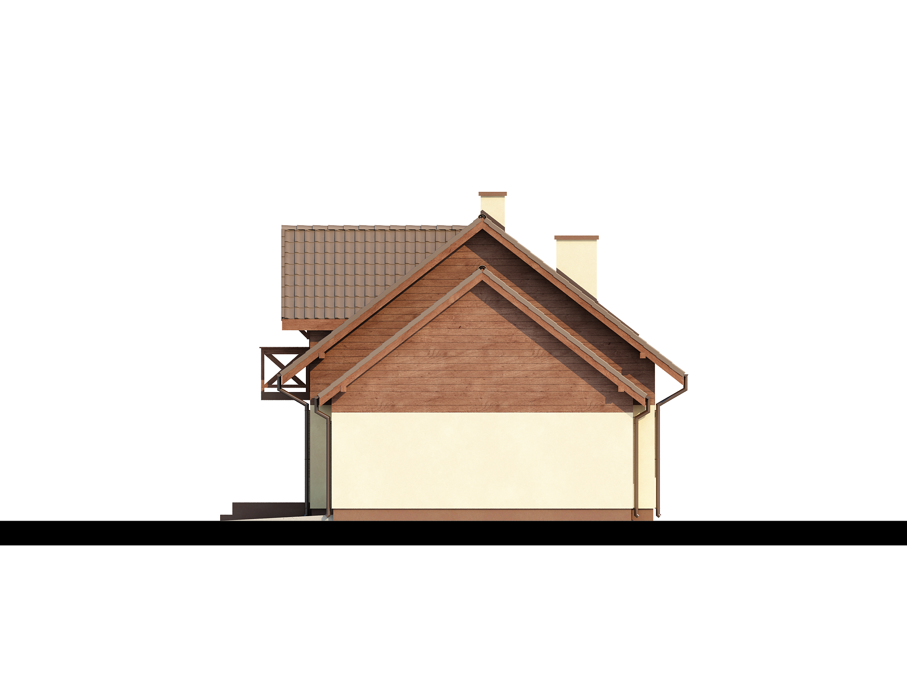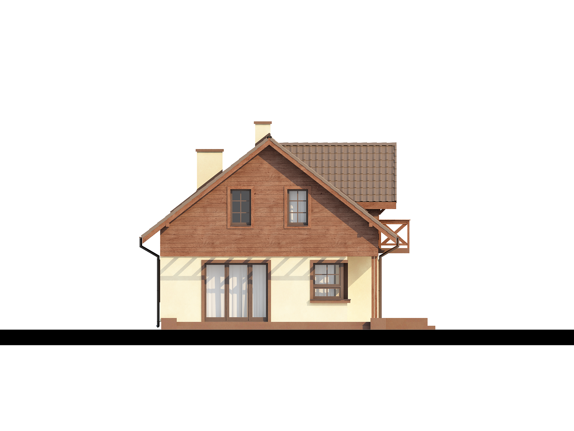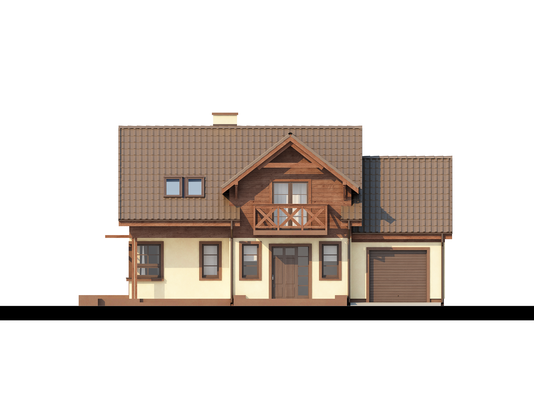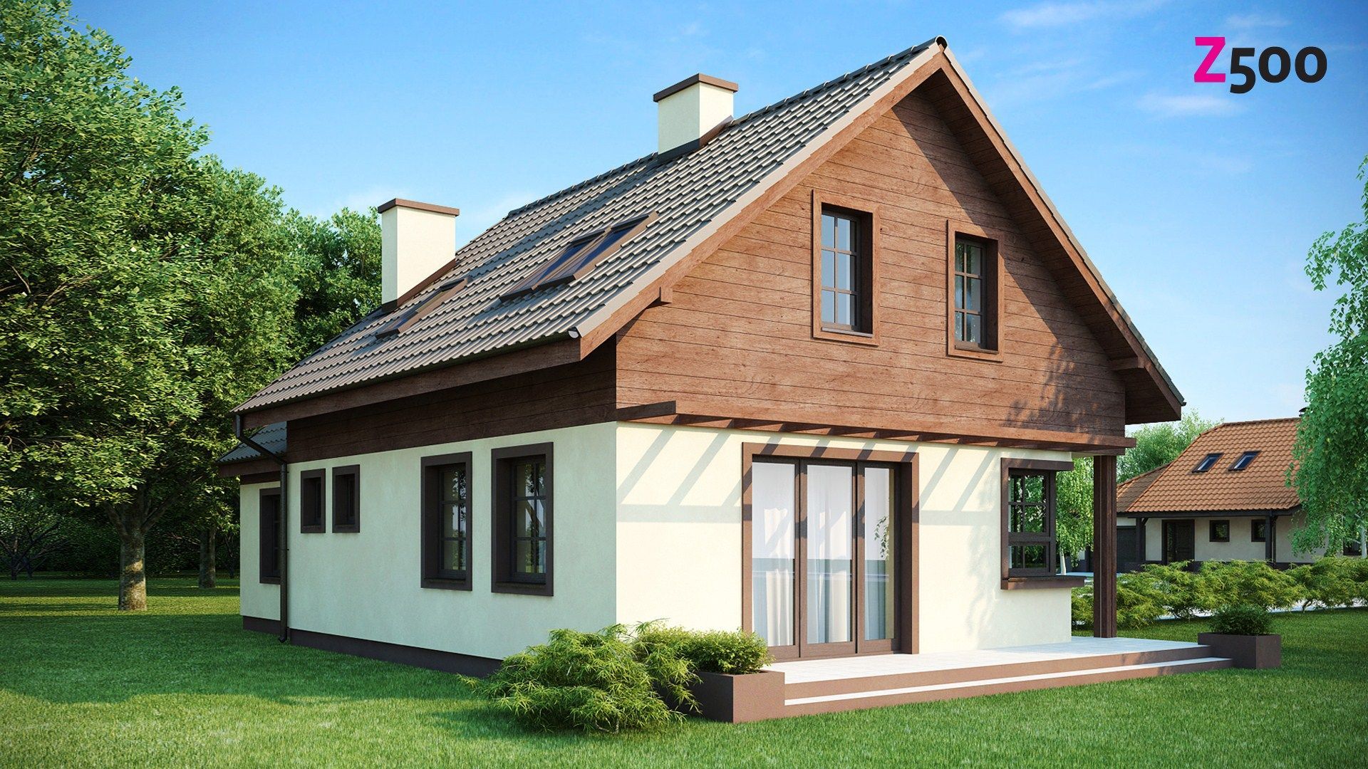 Z33 — это практичный дом с гаражом, с красивым мансардным окном и боковой террасой. Характерная отделка фасадов и балкона из дерева, оформление террасы подчеркивают его традиционный характер.