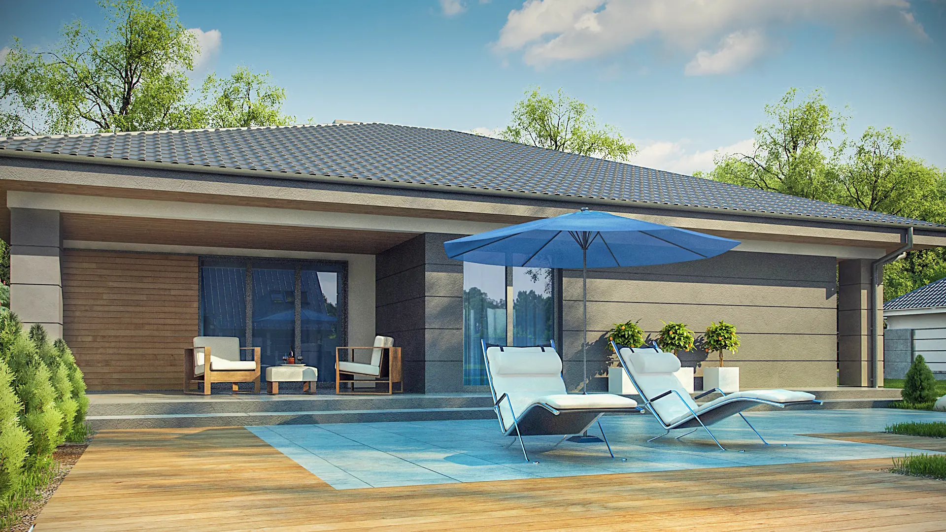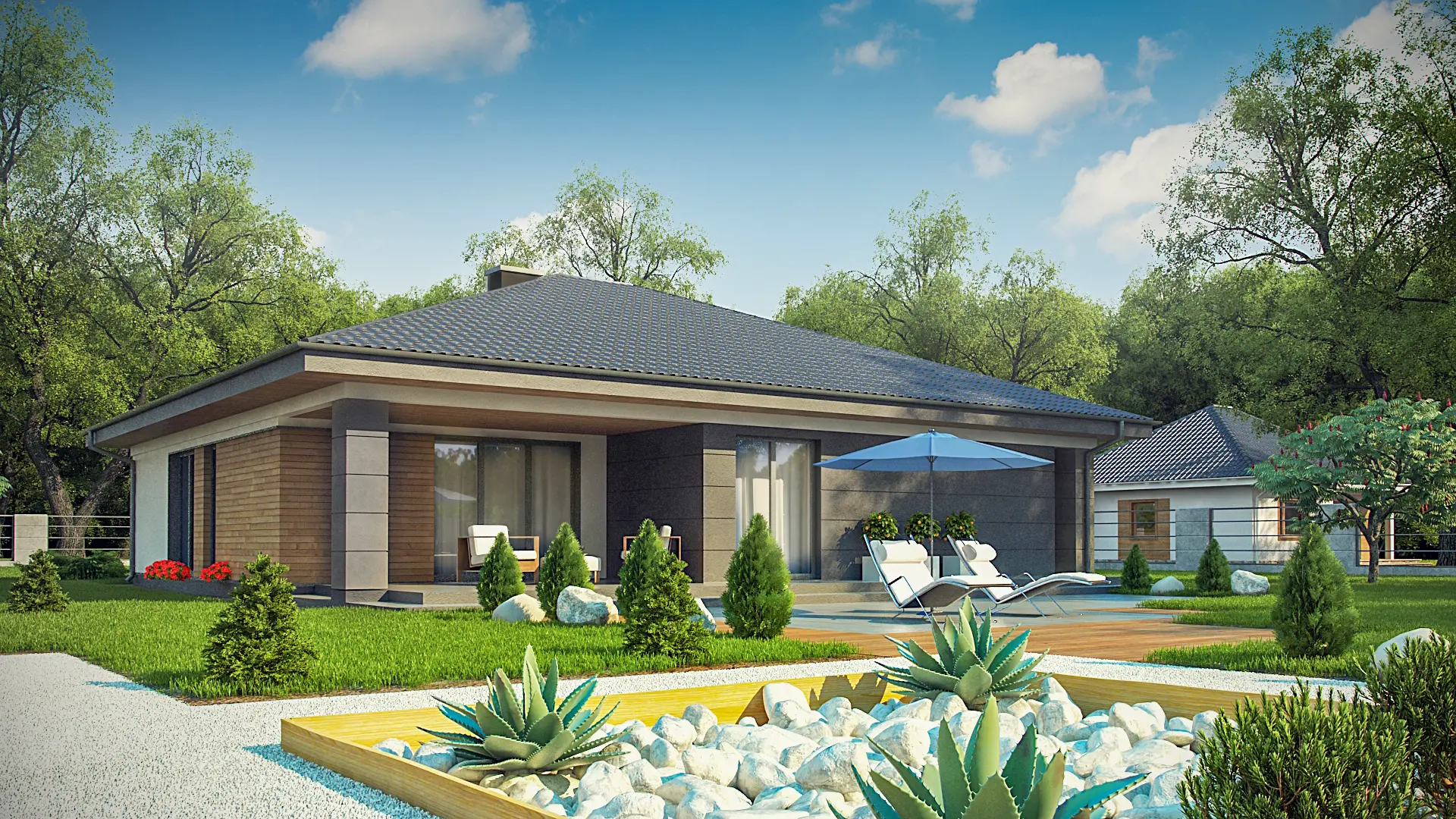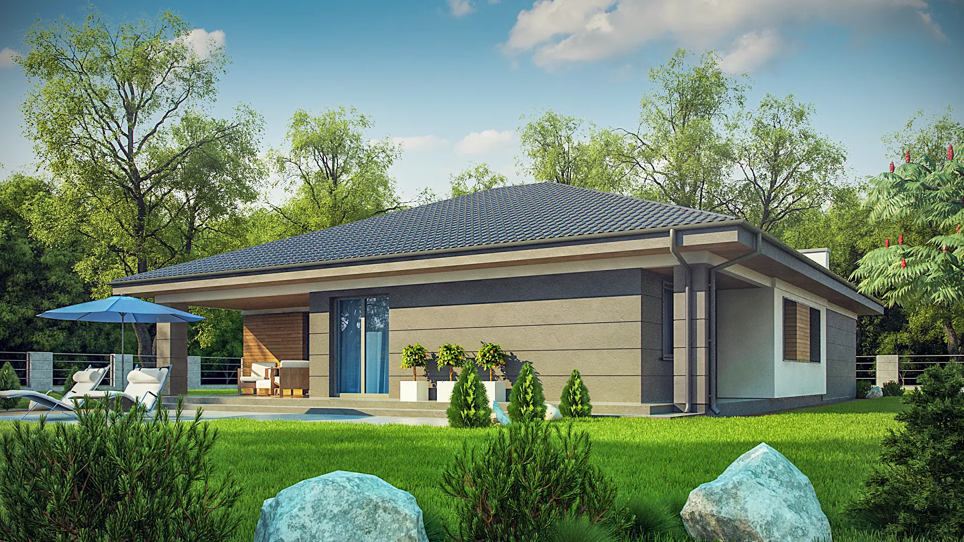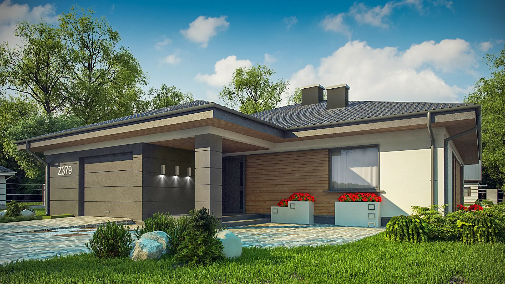 Z379 проект стильного одноэтажного дома с функциональной планировкой. Дом подойдет как ценителям традиционного стиля, так и сторонникам современной архитектуры.
