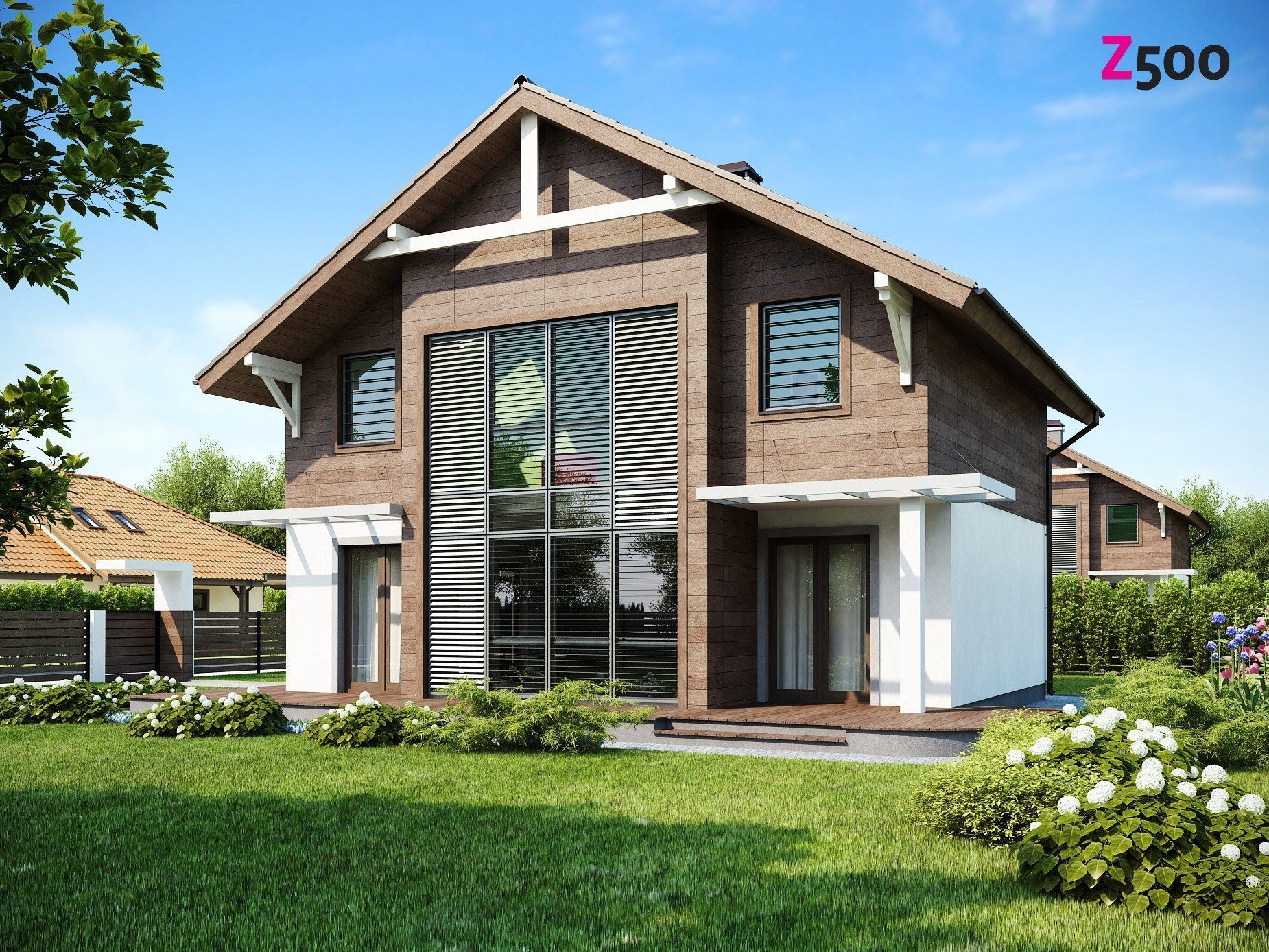 Проект мансардного дома Z47 выделяется среди других таким характерным элементом современной архитектуры, как большая площадь остекления, единая для первого и второго этажей.