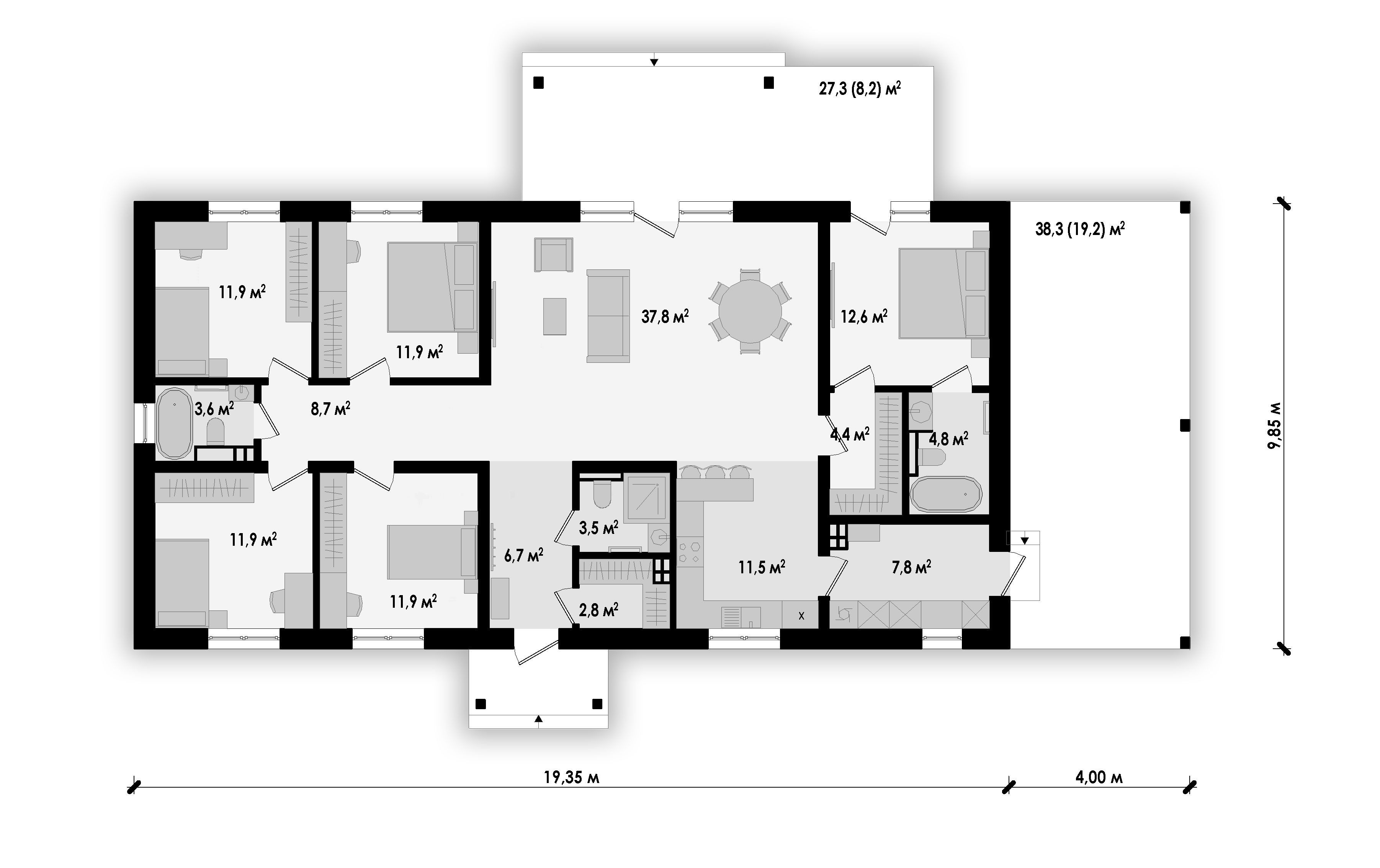 Наши проекты разработаны под стеновые блоки из газобетона, керамзитобетона или керамического блока, поскольку они являются взаимозаменяемыми. Состав наружной стены представляет собой пирог из блока 375мм и утеплителя 50мм/100мм, внутренние несущие стены — это блок 250мм, перегородки — блок 100мм. Вместо блоков 375мм/250мм/100мм, можно использовать блоки 300/400мм, 300мм, 120/150мм соответственно.