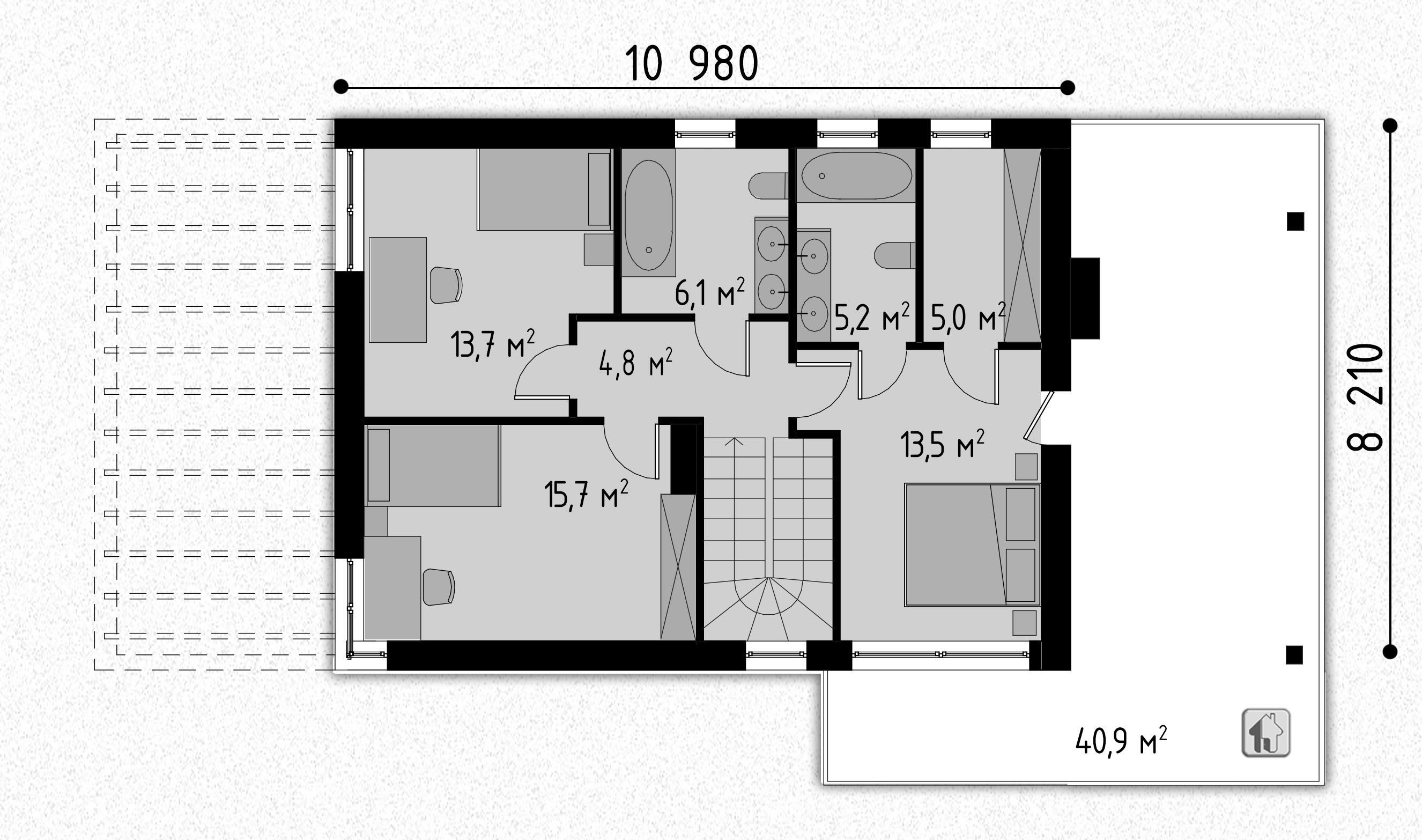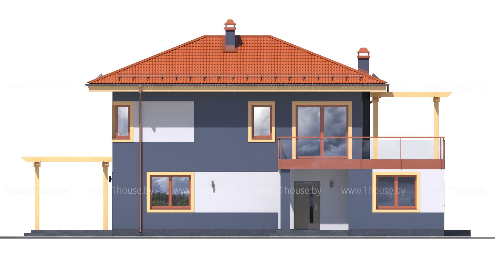 Высота до чистового потолка в наших проектах равна 2,8 метра на 1-ом этаже и 2,7 метра на 2-ом этаже. Если нужна высота потолка больше, то можно поднять крышу без ущерба архитектуре на 1 блок (200-250мм).