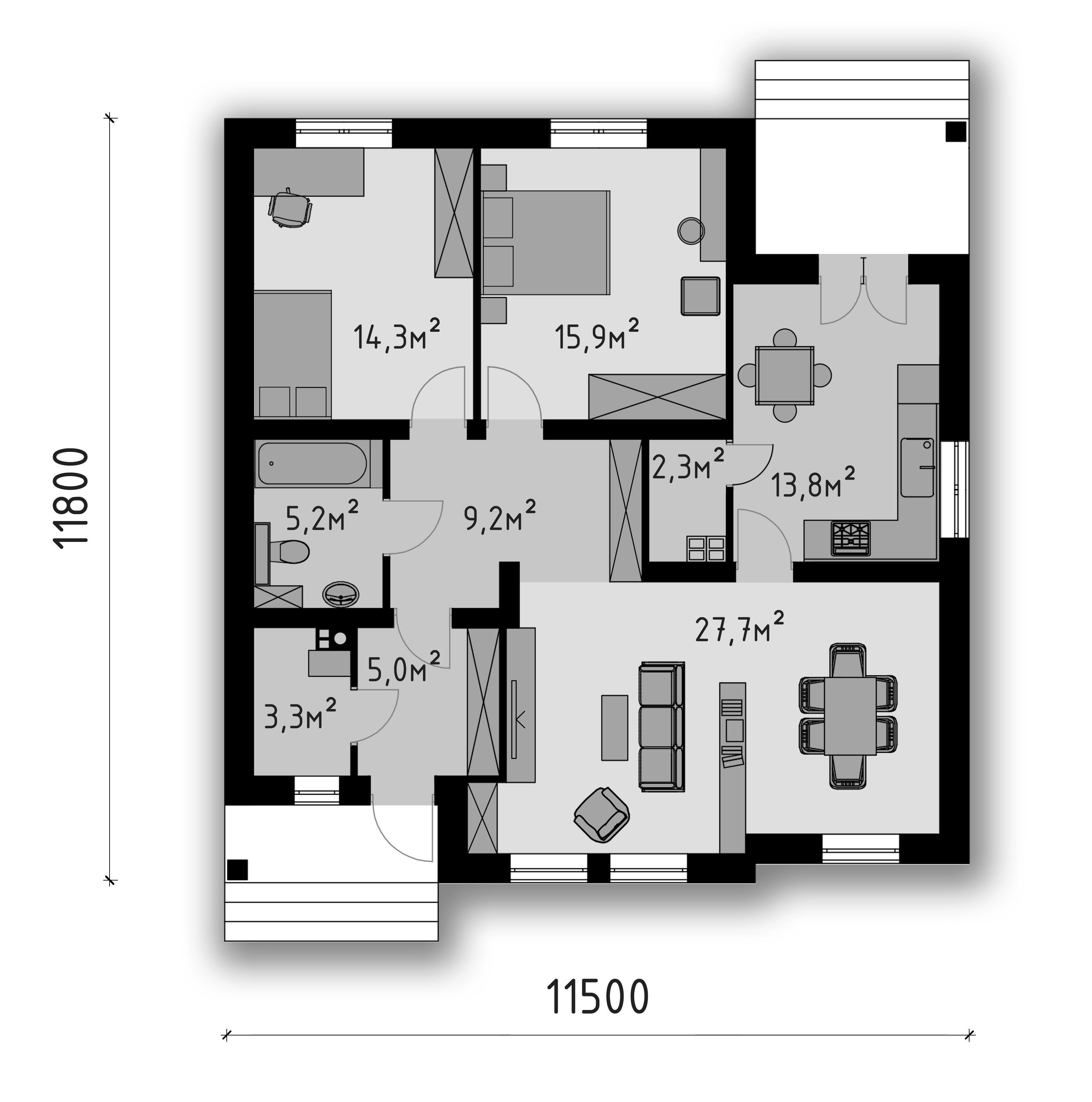 Наши проекты разработаны под стеновые блоки из газобетона, керамзитобетона или керамического блока, поскольку они являются взаимозаменяемыми. Состав наружной стены представляет собой пирог из блока 375мм и утеплителя 50мм/100мм, внутренние несущие стены — это блок 250мм, перегородки — блок 100мм. Вместо блоков 375мм/250мм/100мм, можно использовать блоки 300/400мм, 300мм, 120/150мм соответственно.