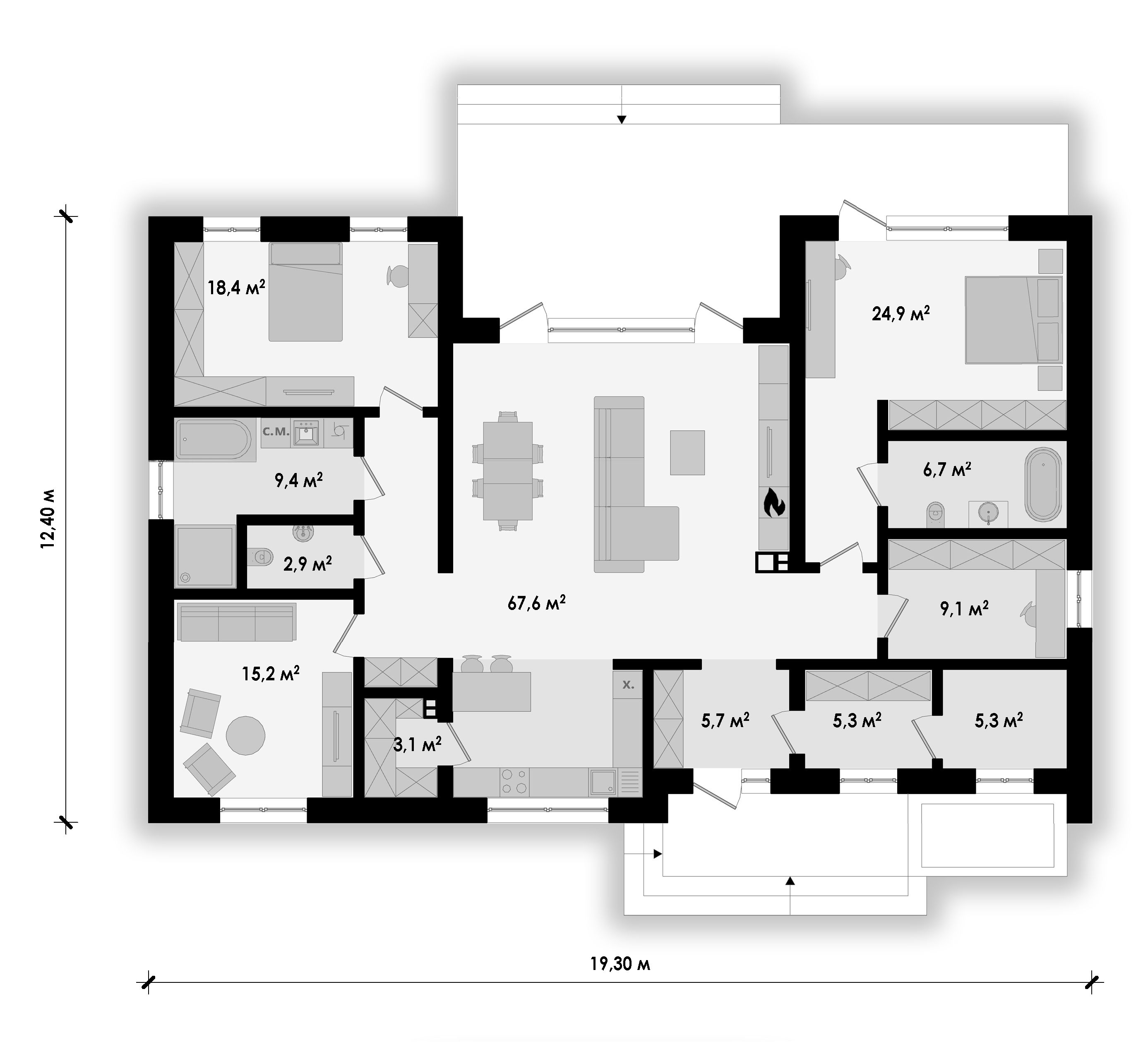 Одноэтажный дом с 4мя комнатами и гостиной в центре.