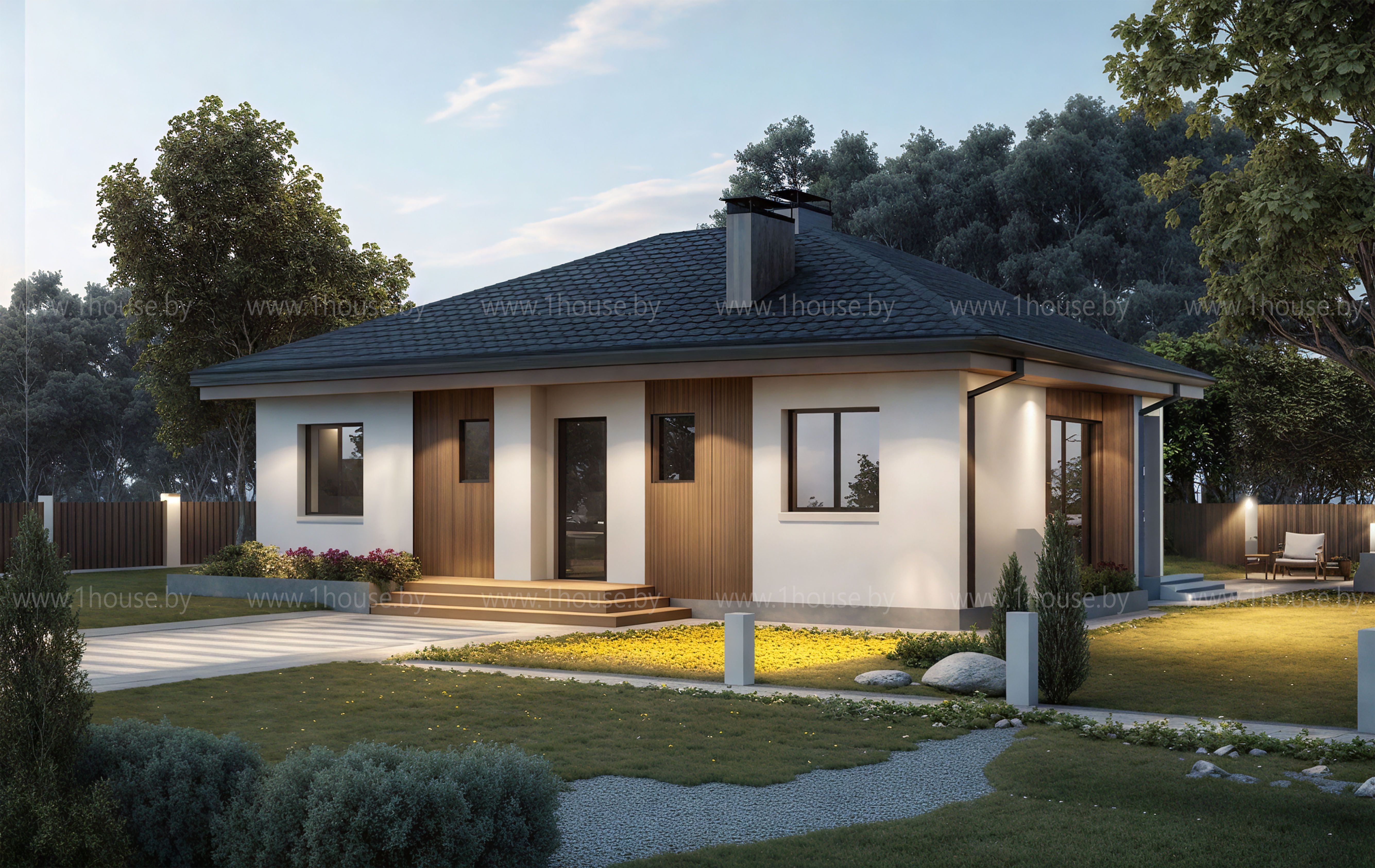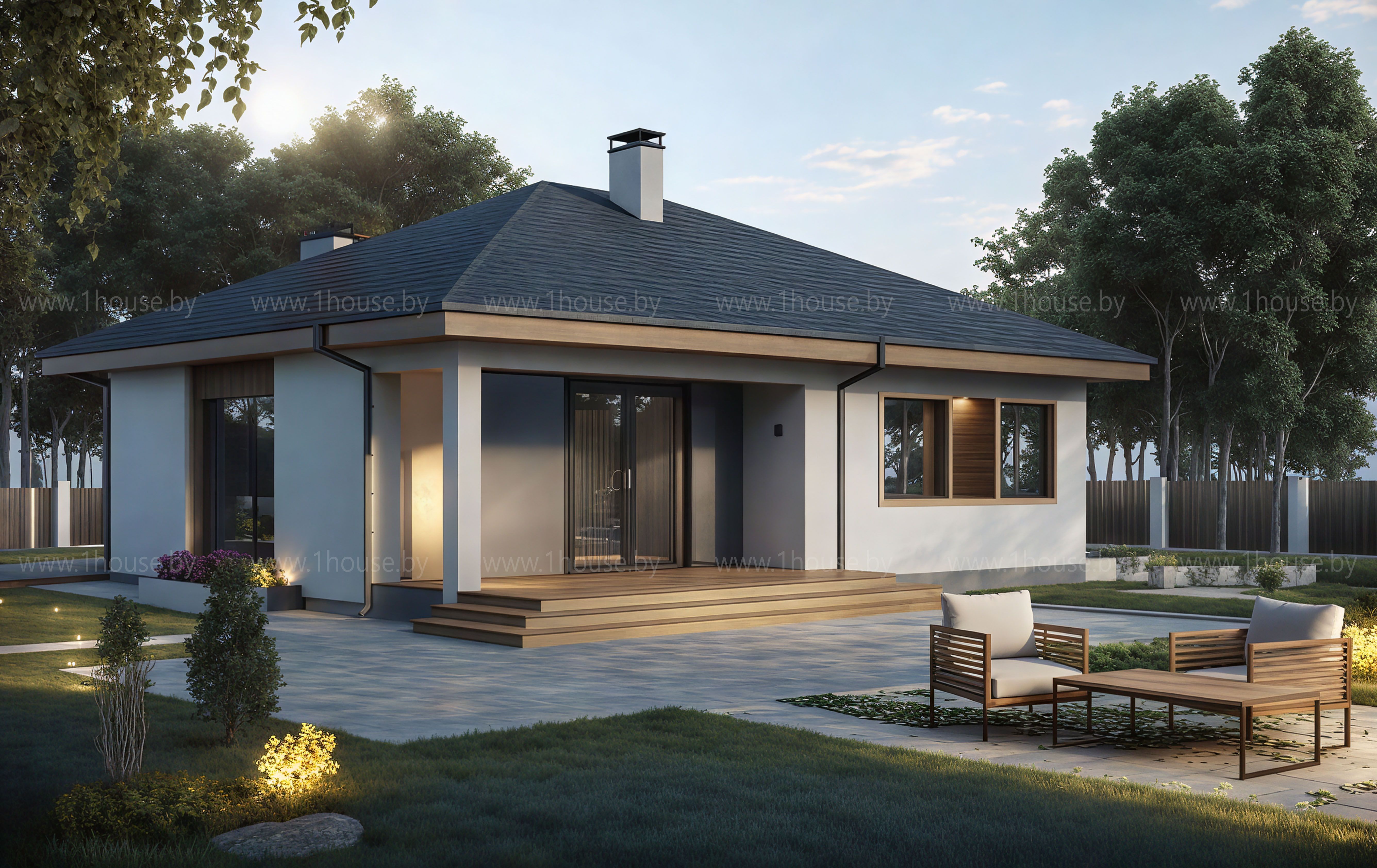 Проект дома H7 можно назвать традиционным и лаконичным. В планировке внутренних пространств нет ничего лишнего. Проект H7 подойдёт для людей, которые предпочитают функциональность и простоту для своей жизни. Все помещения расположены на первом этаже, что способствует удобству перемещения по дому, а также значительно сокращает сроки строительства и его стоимость. Планировка первого этажа включает три спальни, кухню, гостиную, имеющую выход на террасу, обширную ванную комнату. Внешний вид современен и в то же время приближен к традиционному облику европейских одноэтажных домов, что создаёт особый уют и камерность. На фасадах используются вставки из натурального дерева.