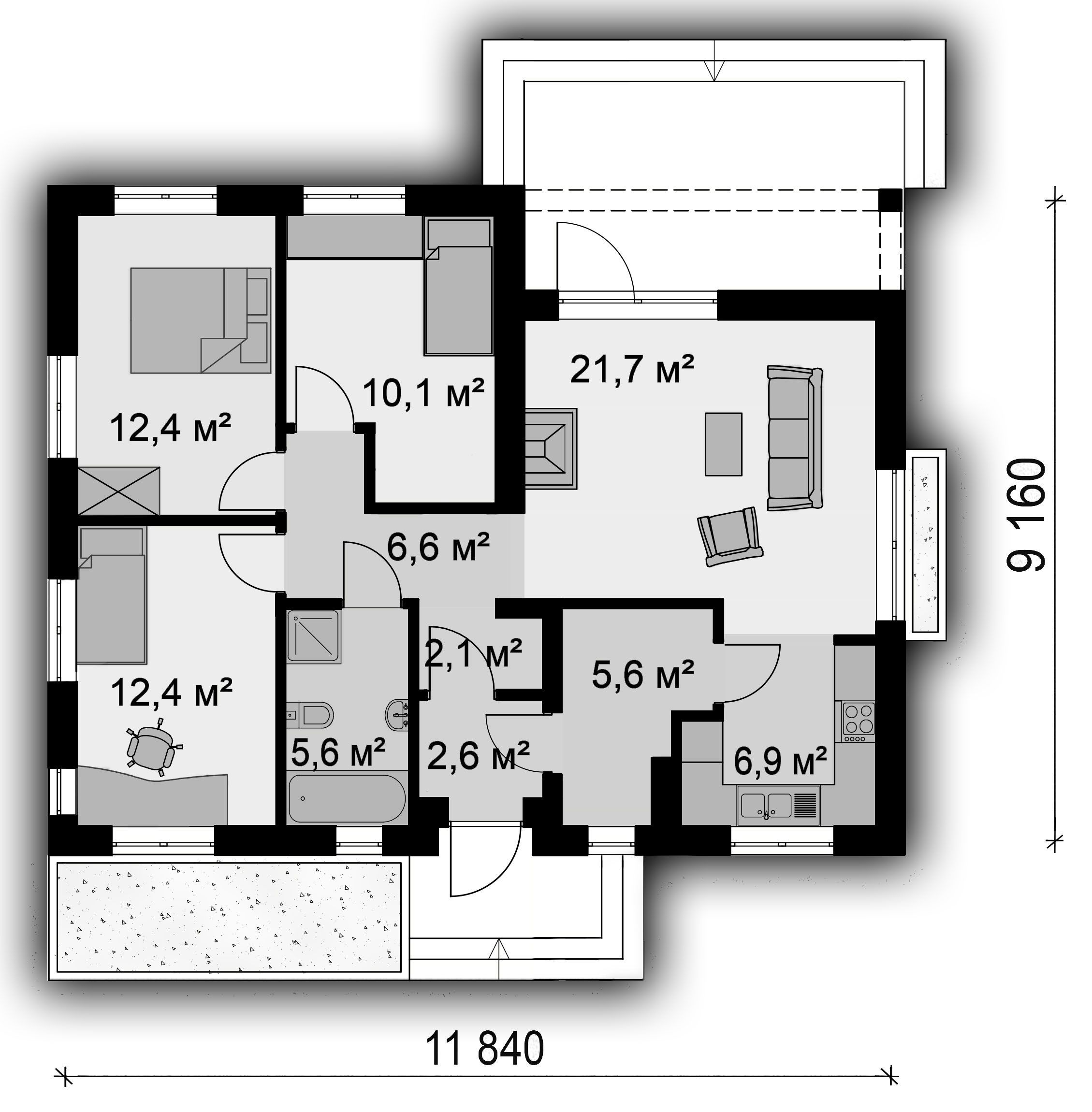 Одноэтажный дом с 3мя спальнями и террасой.