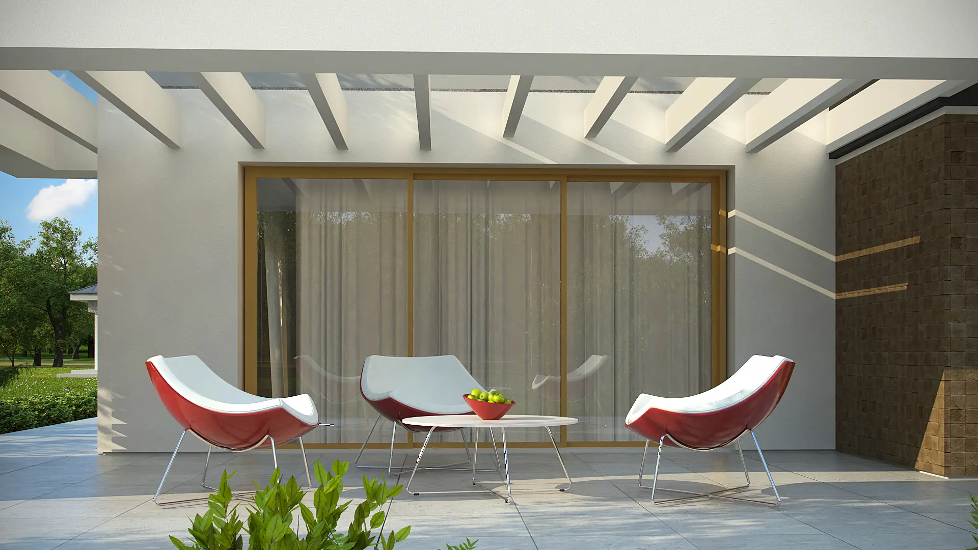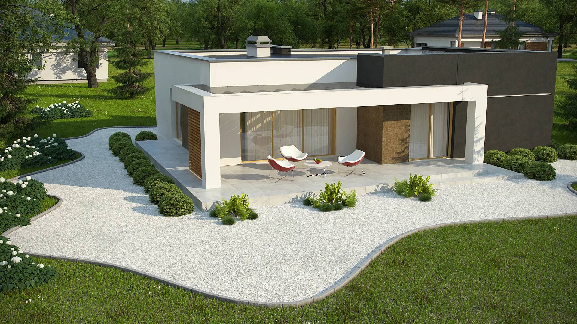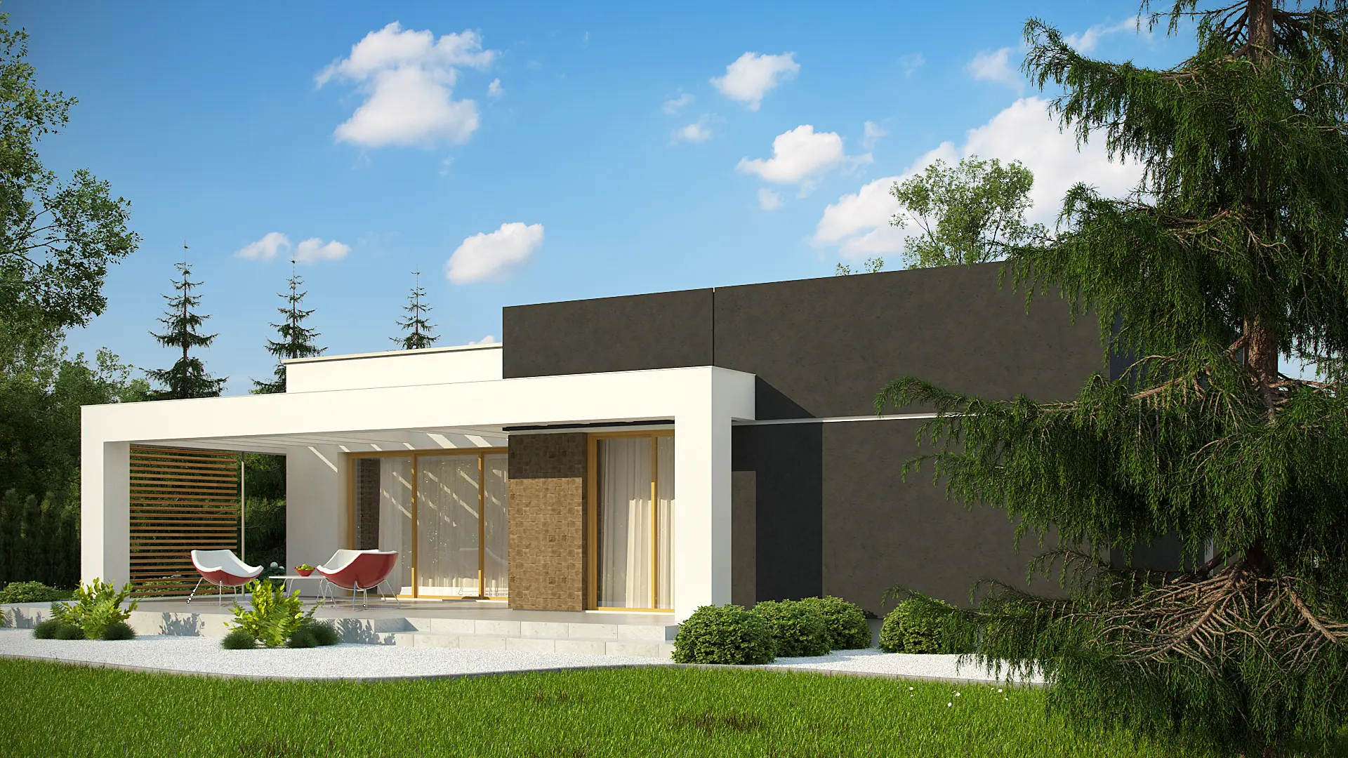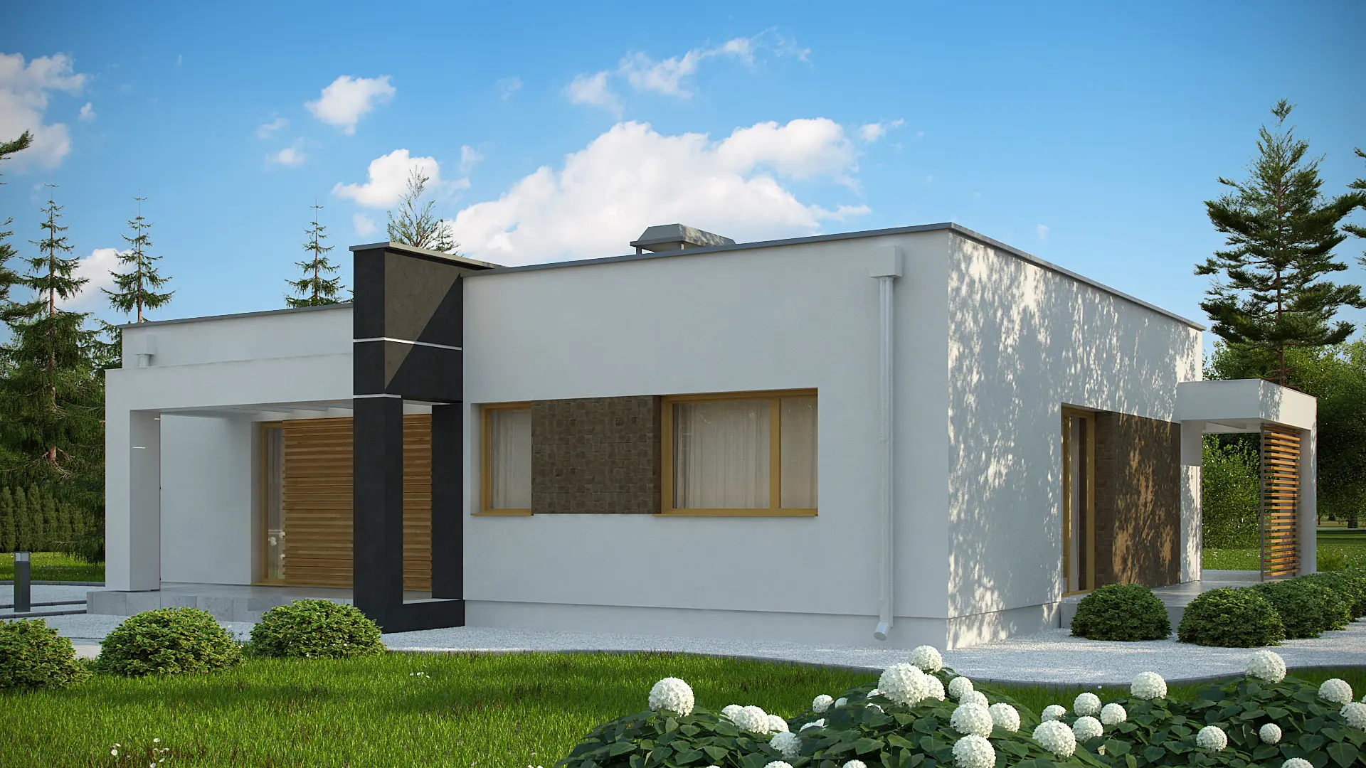 Разработка Zx105 B представляет увеличенную версию проекта Zx105 с гардеробными в каждой спальне. В данном варианте оформление фасада решено в контрастных оттенках цвета экрю, тёмно–коричневого и охры. Такая стилистика выгодно подчёркивает современные контуры здания, смещая акцент на входную группу. В этом проекте полностью изменена планировка ночной зоны. Здесь оборудованы три спальни, в каждой из которых спроектирована собственная гардеробная комната, что, безусловно, создаёт больший комфорт для каждого проживающего.
